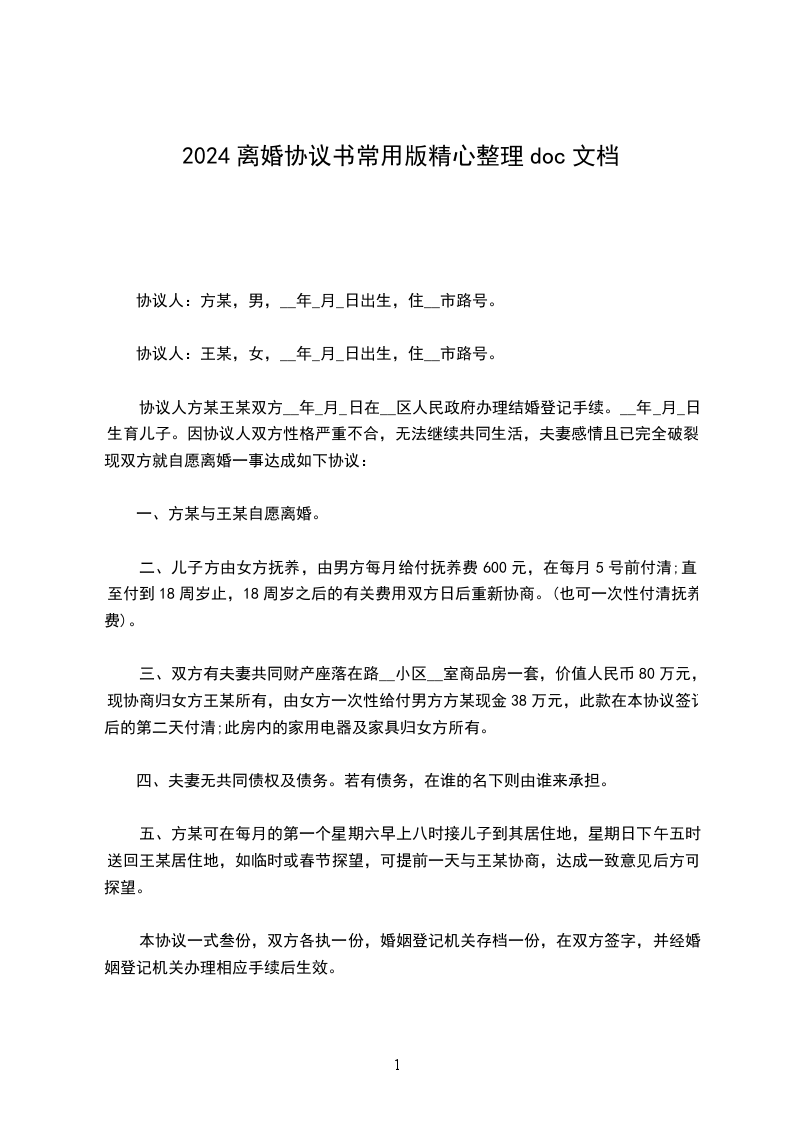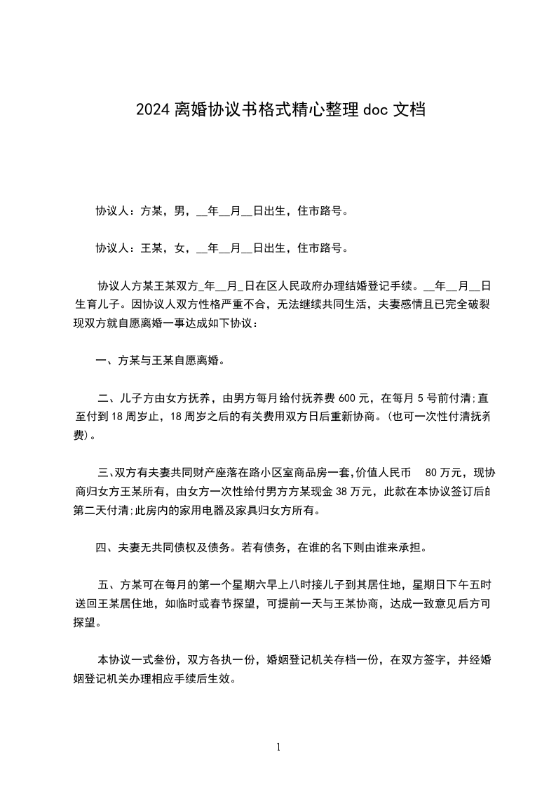 协议人:方某,男,__年__月__日出生,住市路号。