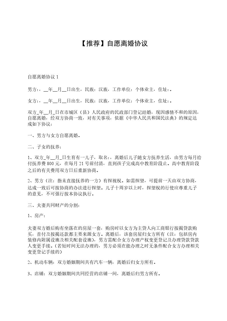 协议人双方________年____月____日登记结婚,________年____月____日生育一子,取名。现协议双方夫妻感情确已完全破裂,经双方协商一致,自愿离婚、财产分割及子女抚养事宜达成如下协议: