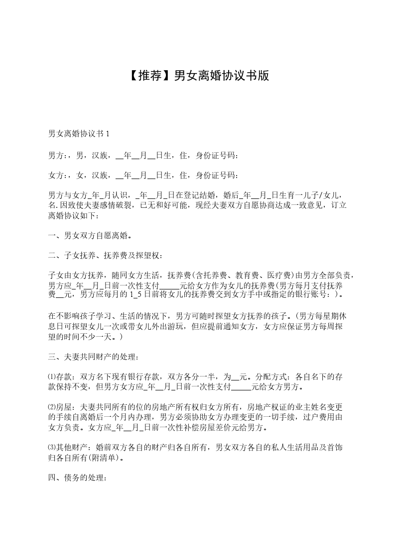 男女离婚协议书4男方:_______,汉族,生_______年_______月_______日
