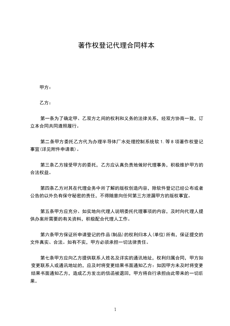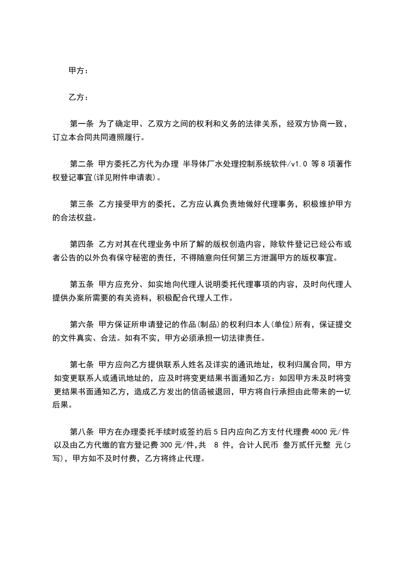第二条 甲方委托乙方代为办理 半导体厂水处理控制系统软件/v1.0 等8项著作权登记事宜(详见附件申请表)。