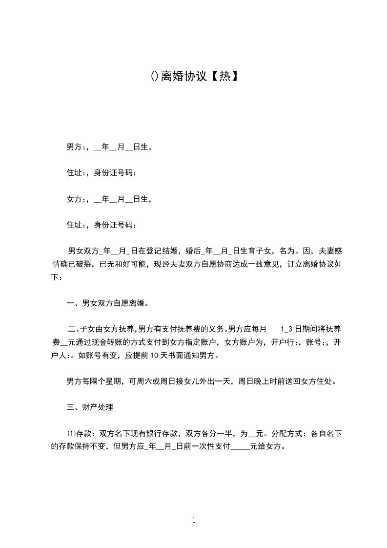 男女双方____________________年__________月相识,____________________年__________月__________日在民政局登记结婚,结婚证字号:。婚后__________年__________月__________日生育__________,名。因婚后性格不合以及家庭原因,现夫妻感情完全破裂,已无和好可能,经双方自愿协商达成一致意见,订立离婚协议如下: