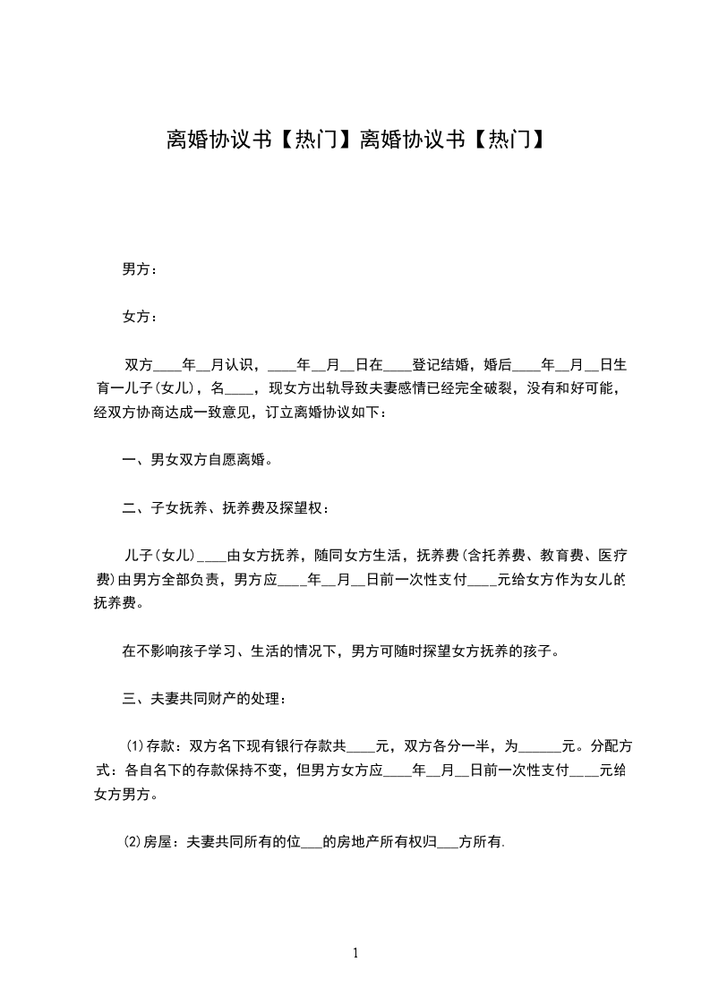 男女双方______年______月______日登记结婚,______年______月______日生儿子,但由双方感情不和与______年______月______日离婚,离婚后双方______年______月______日办理复婚,现因夫妻感情又破裂,已无和好的可能,在平等、自愿的基础上,经双方共同协商,达成协议如下: