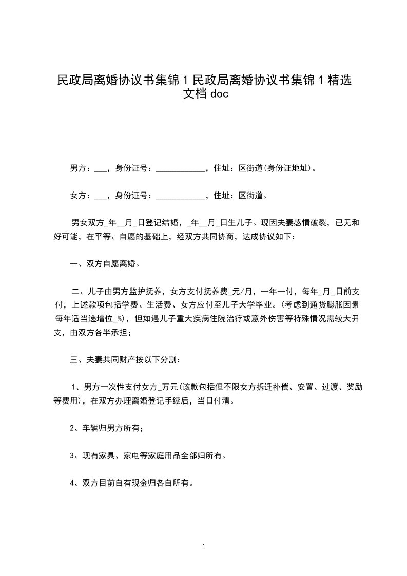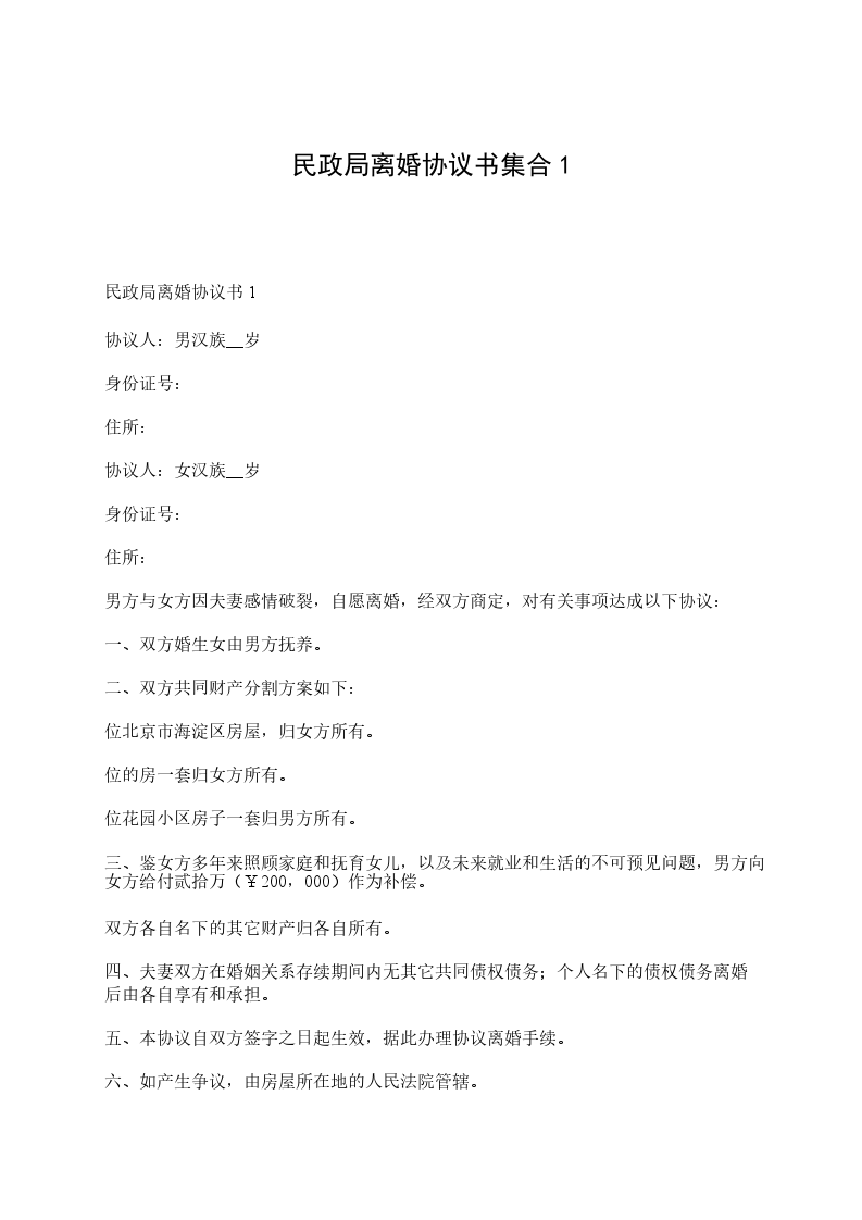 七、本协议书一式三份,甲乙双方各执一份,婚姻登记部门保留一份。在双方签字,并经婚姻登记机关办理相应手续后生效。