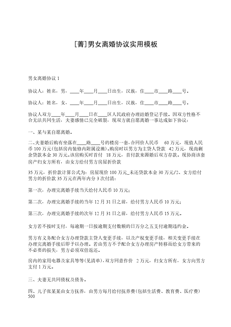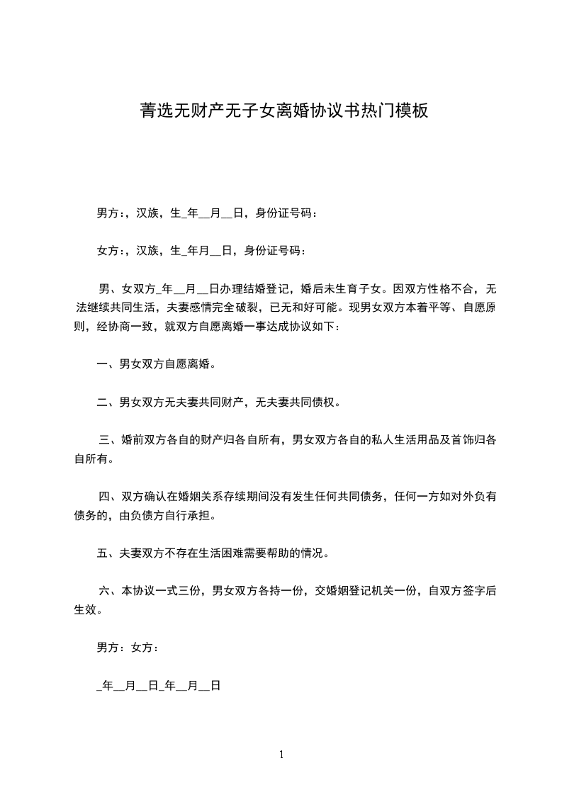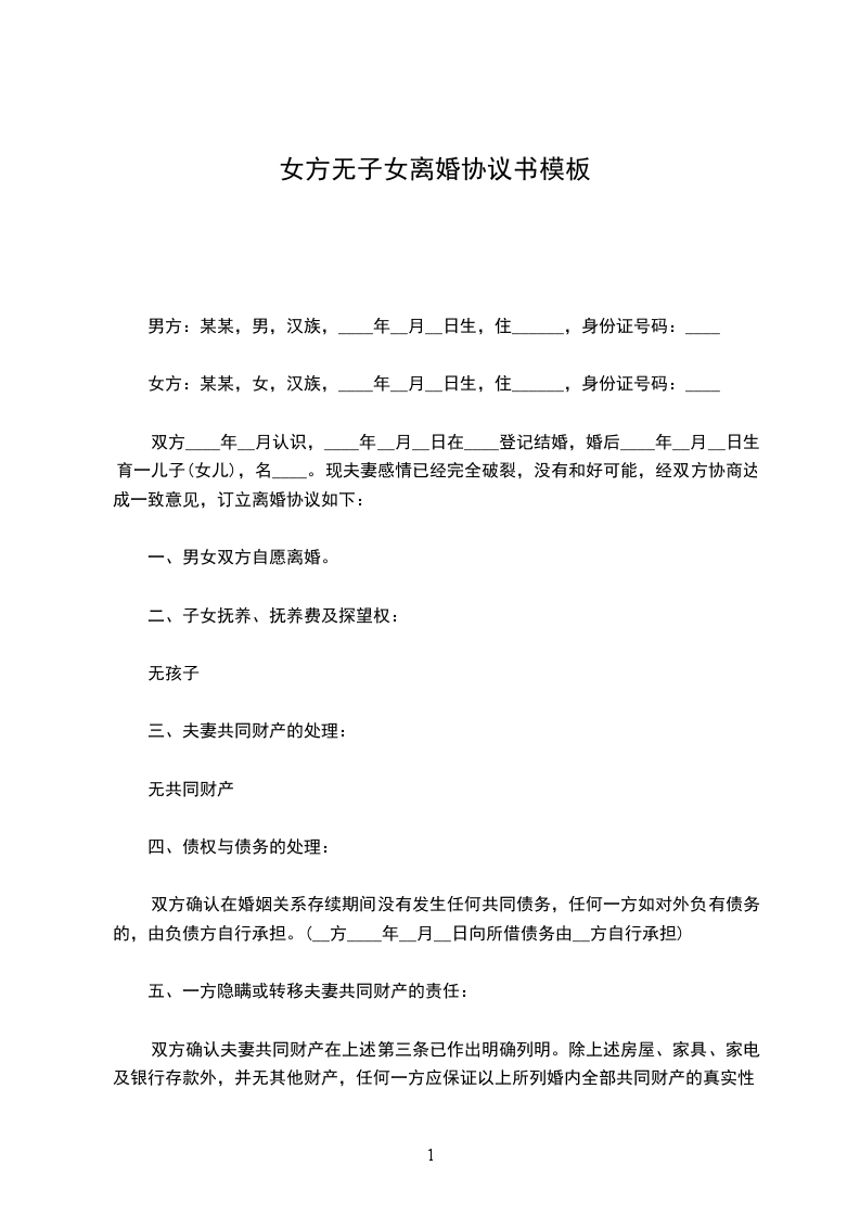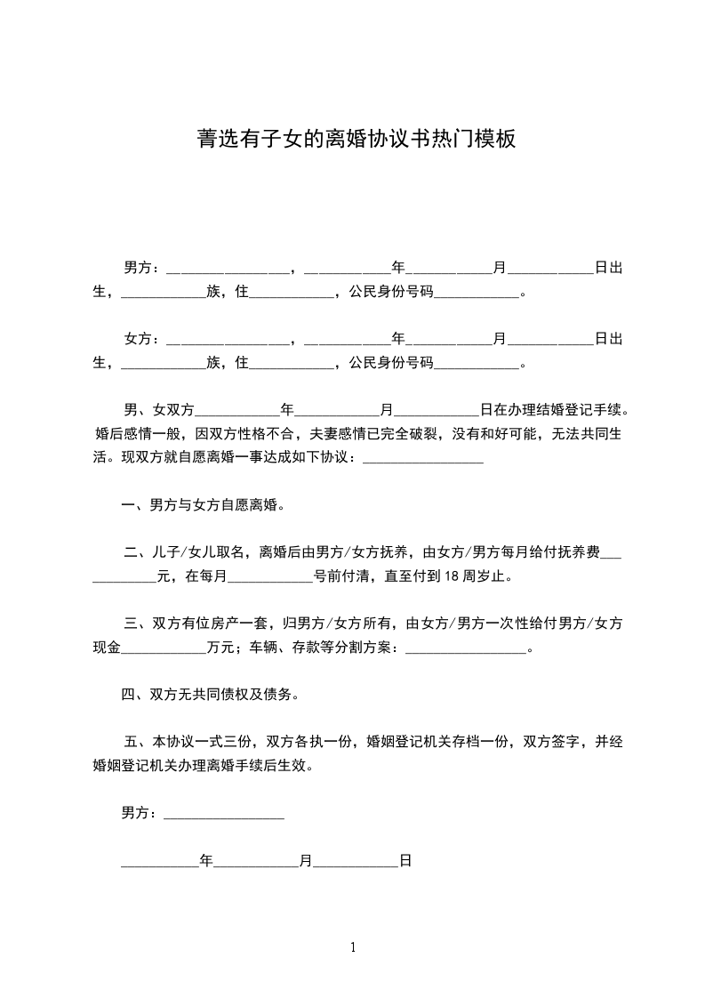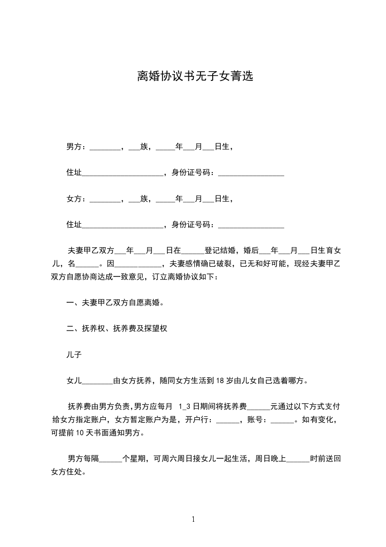 男女双方_________年_________月_________日结婚,_________年_________月生一女(子)_________,现就离婚事宜达成如下协议,供双方遵照执行: