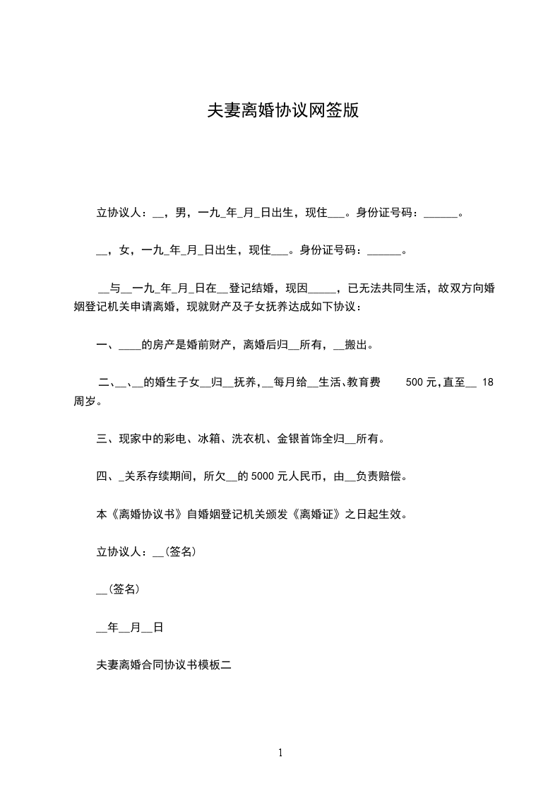 1、双方_年_月_日生育有一儿子/女儿,取名:,离婚后儿子/女儿随男方/女方直接抚养生活,由女方/男方每月给付抚养费(包括生活费、教育费、医疗费)_元,在每月_号前付清,直到孩子完成高中教育阶段止。高中教育阶段之后的有关费用双方日后重新协商。