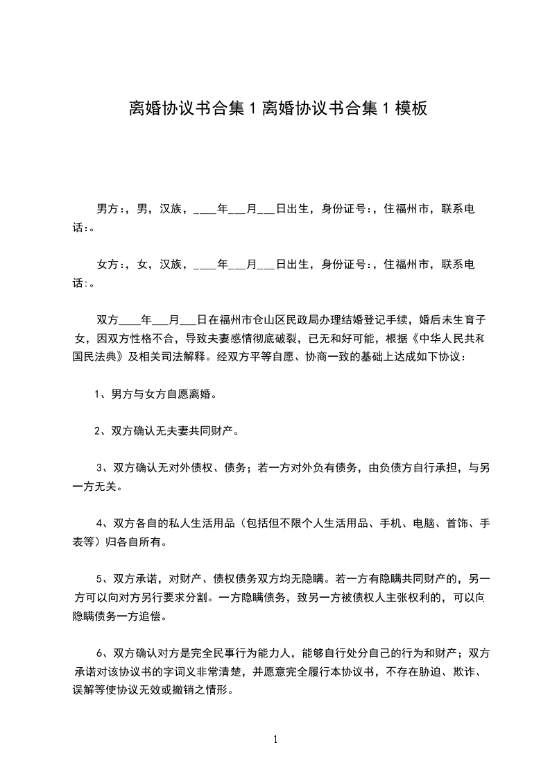 男女双方____年____月____日在________民政局登记结婚,____年____月____日,婚生子/女____________出生,现因夫妻双方感情完全破裂,亦无和好的可能,男女双方在平等自愿的基础上,就离婚事宜达成如下协议: