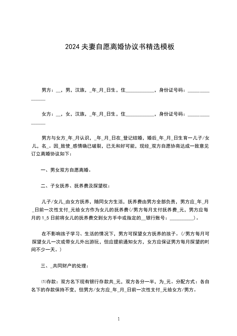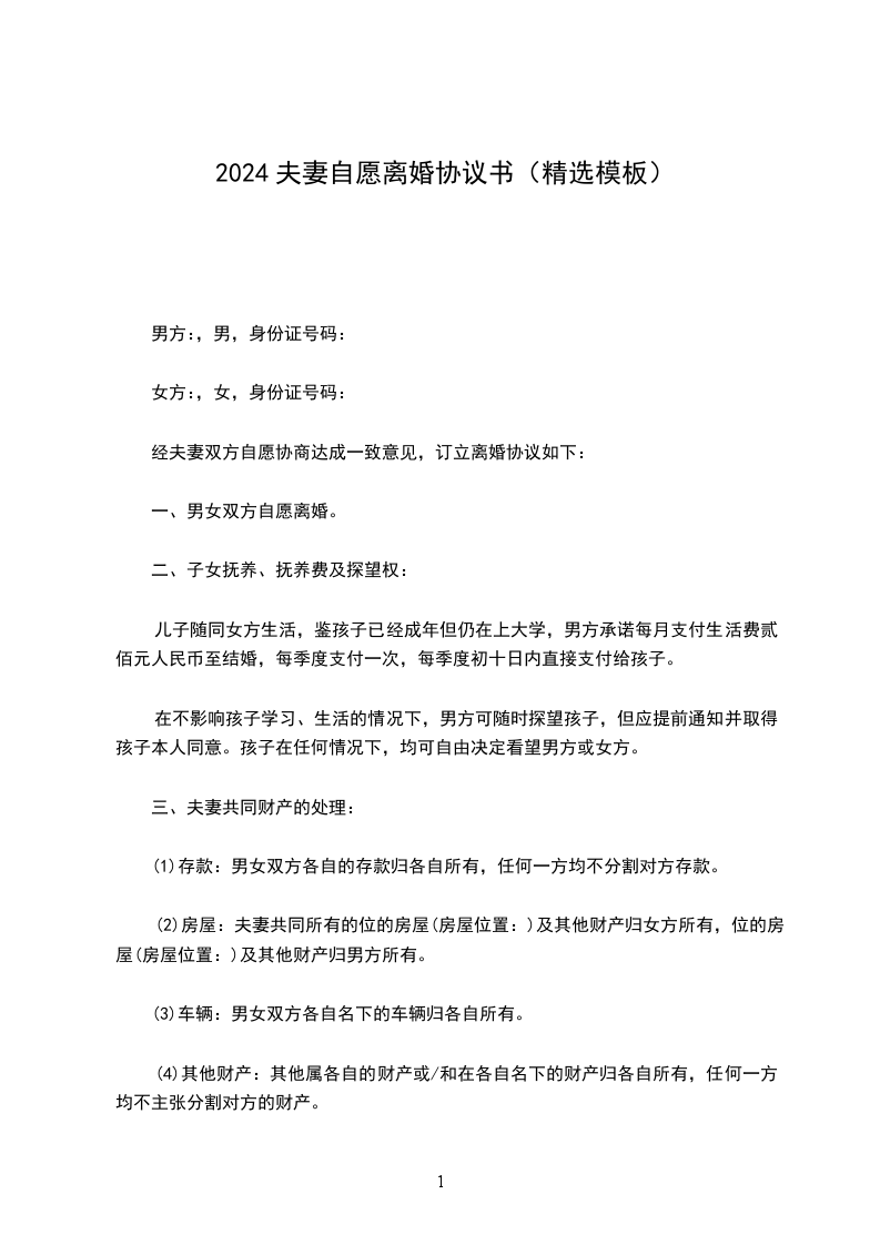 男方与女方_____年____月____日经恋爱结婚,婚后感情尚好,生有一子__。因近一年来女方沉溺麻将,经常整夜不归,不尽照顾家庭和儿子的义务。为此经常发生争吵,矛盾日益激化,夫妻感情受到极大伤害,经居委会、亲戚朋友劝解无效,双方都认为无法共同生活下去,故协议离婚如下: