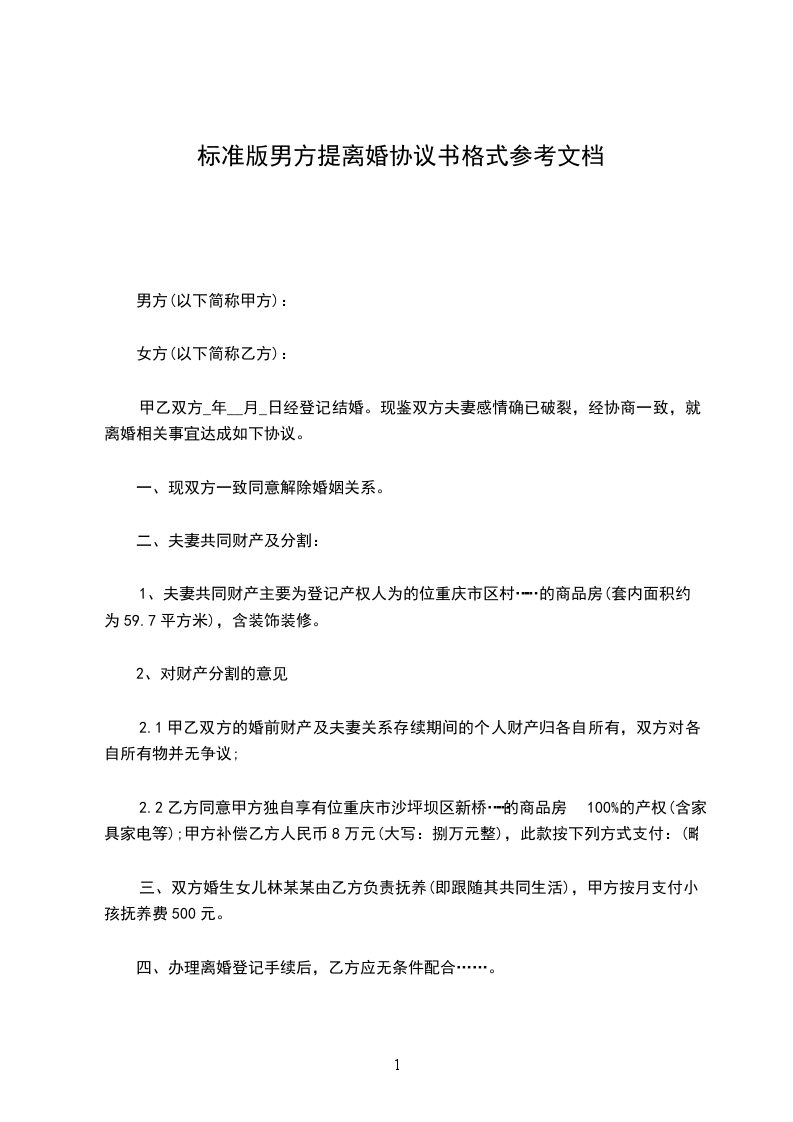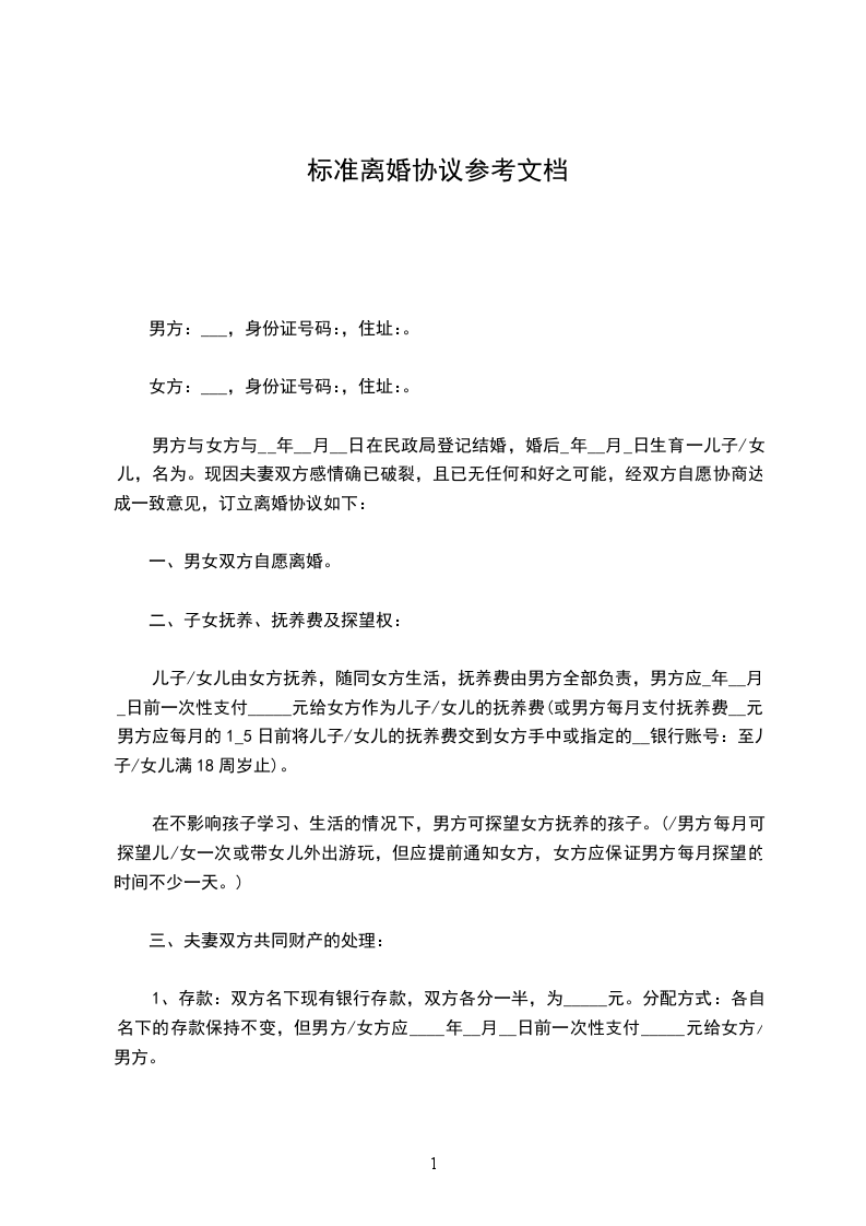 标准离婚协议参考文档