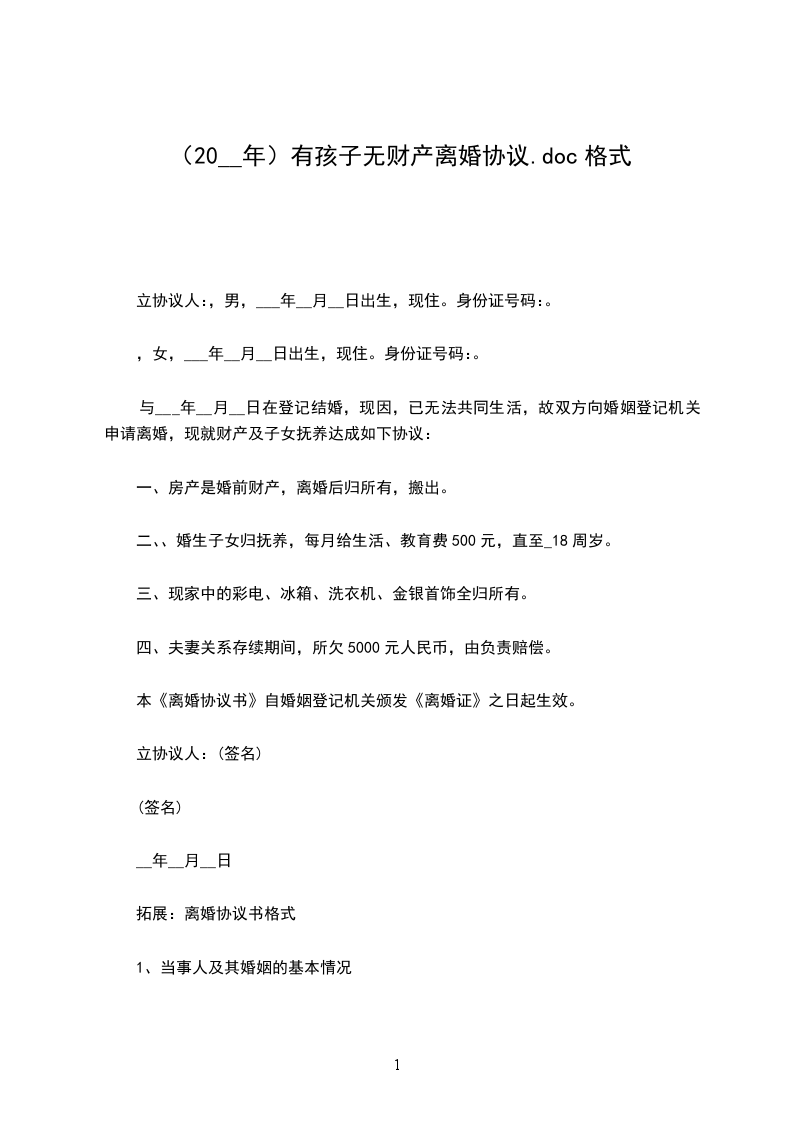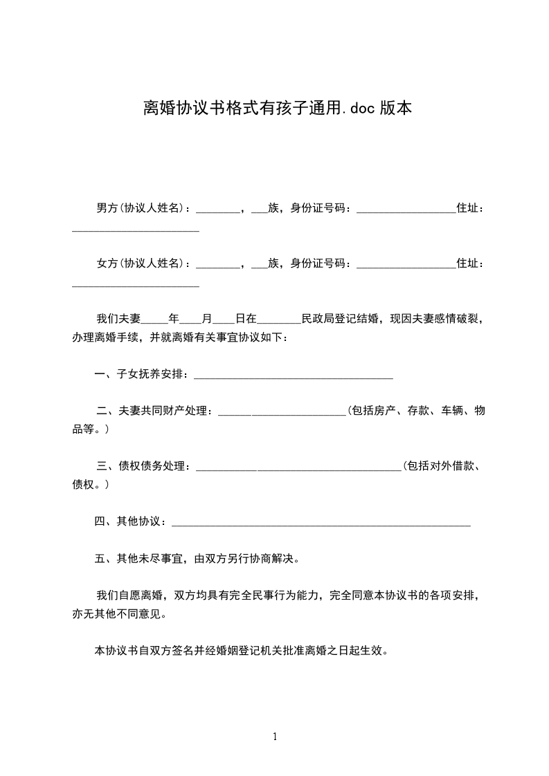 男方与女方_年_月认识,_年__月_日在登记结婚,婚后_年__月_日生育一儿子/女儿,名。因致使夫妻感情破裂,已无和好可能,现经夫妻双方自愿协商达成一致意见,订立离婚协议如下: