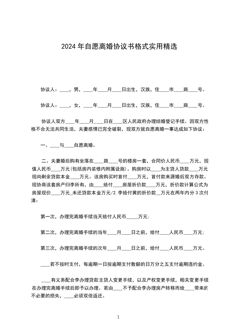 b夫妻双方婚后购有坐落在___路___号___小区___栋___单元___号的楼房一套,购房时以男方/女方为主贷人向___银行按揭贷款购买,首付及按揭还款都来源夫妻共有存款,该房属夫妻共有财产。离婚后,该套房屋归男方/女方所有(注:包括房内装修内附属设施及相关配套设施),双方相互配合办理产权变更登记及办理贷款主贷人变更手续。因办理产权变更登记及办理贷款主贷人变更手续所应支付的一切税费等均由男方/女方承担。取得房屋所有权的一方给予另一方经济补偿人民币_________元,在本协议签订之日起___内付清。