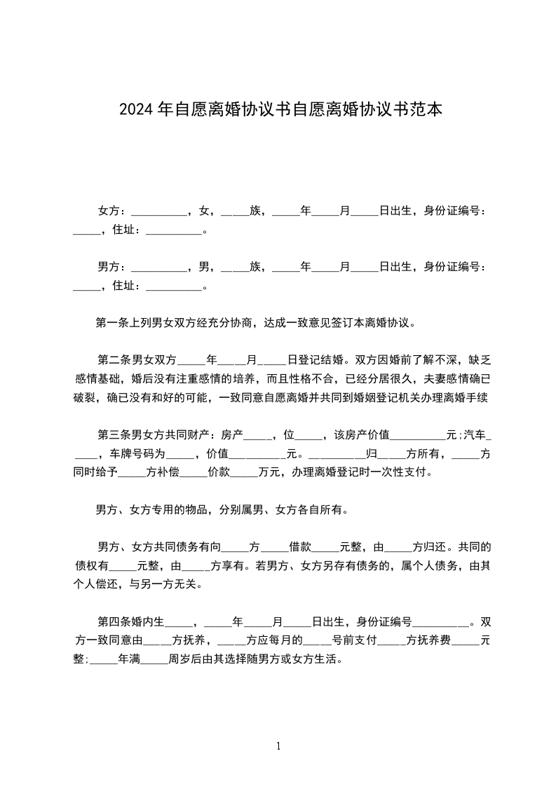 一、男方_________与女方_________自愿离婚。