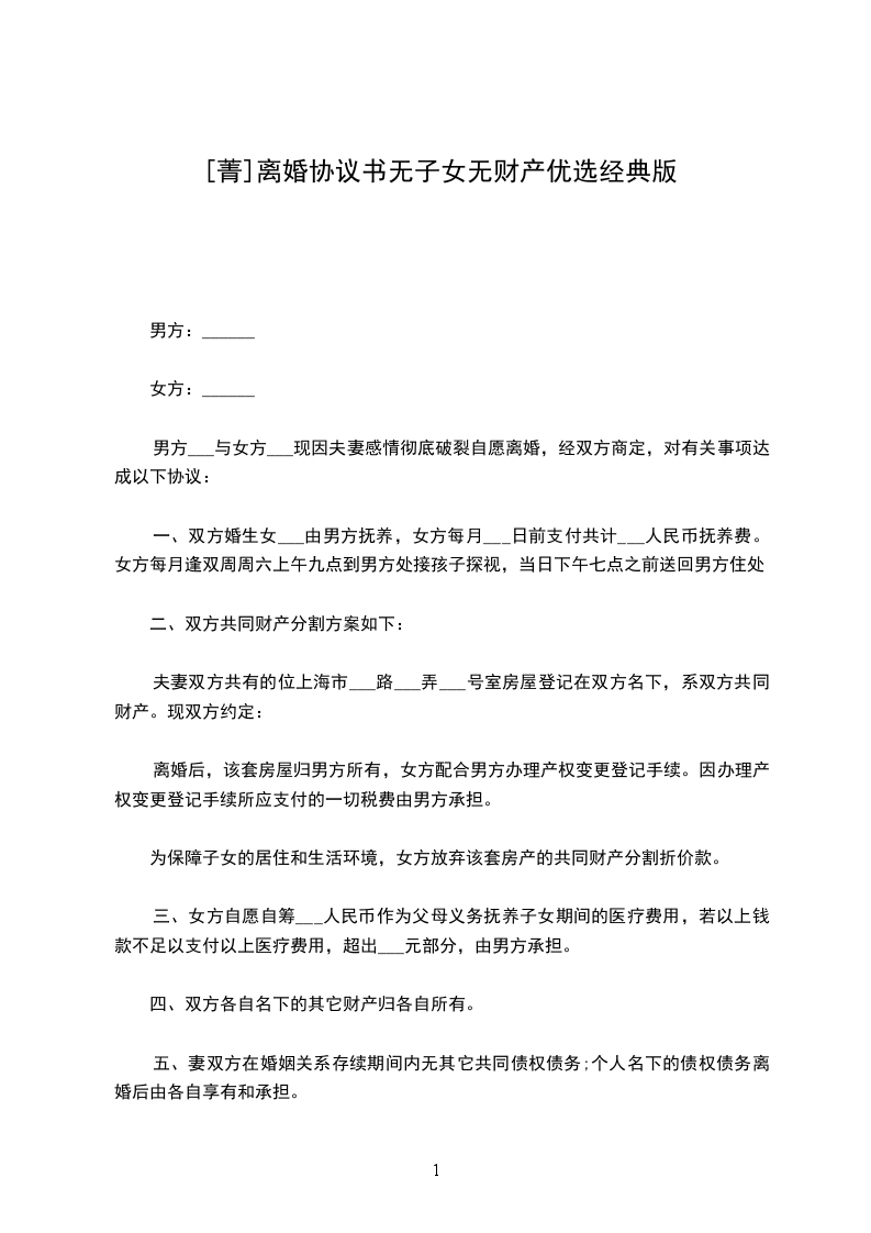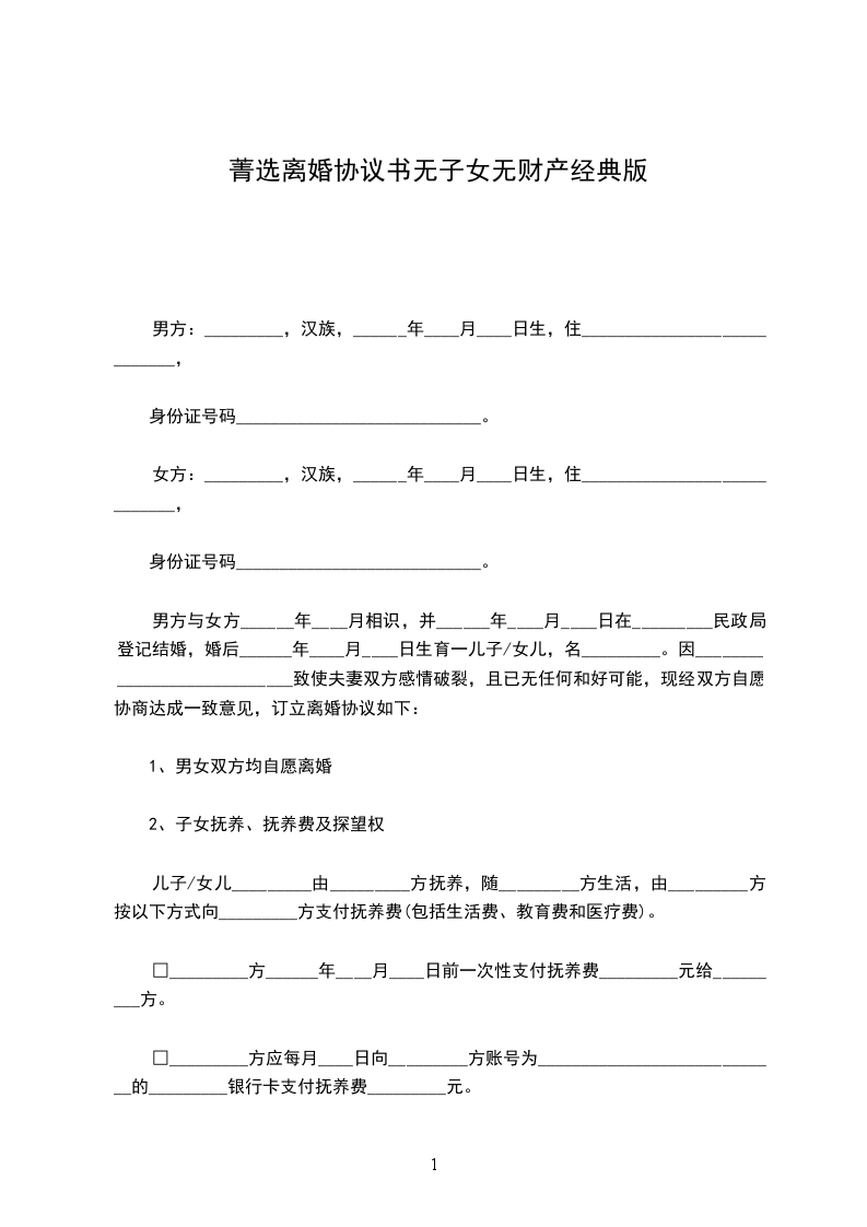 无子女离婚协议书模版2