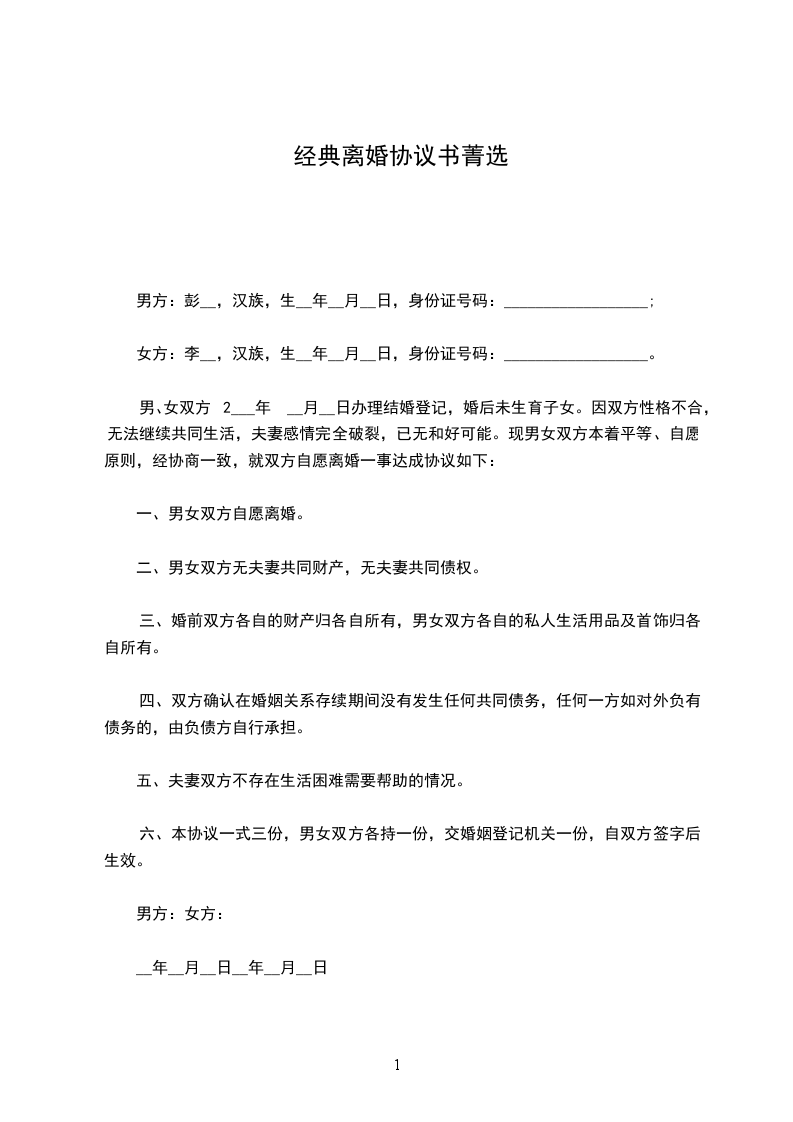男、女双方2___年 __月__日办理结婚登记,婚后未生育子女。因双方性格不合,无法继续共同生活,夫妻感情完全破裂,已无和好可能。现男女双方本着平等、自愿原则,经协商一致,就双方自愿离婚一事达成协议如下: