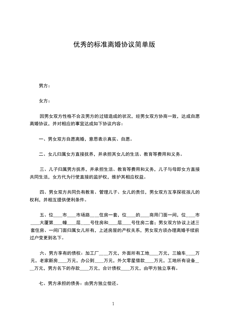 因男女双方性格不合及男方的过错造成的状况,经男女双方协商一致,达成自愿离婚协议,并对相应的事宜达成如下协议内容: