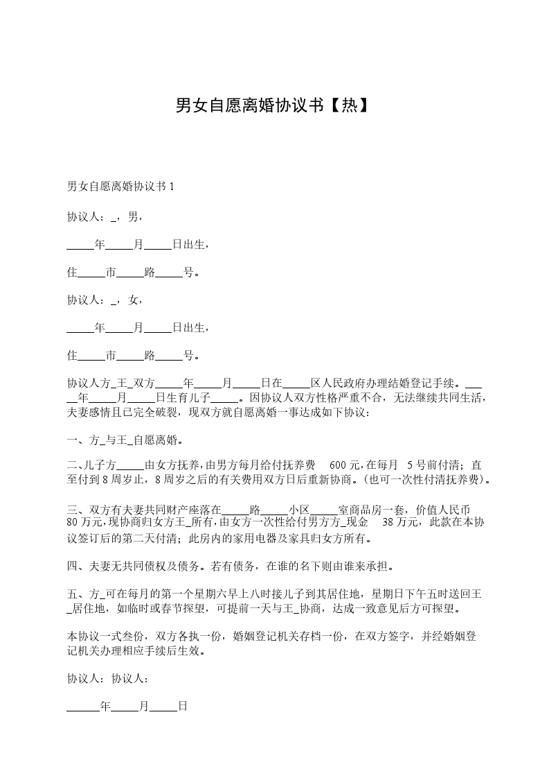 男女自愿离婚协议书1