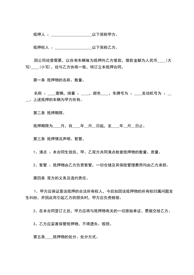 第五条乙方提供的抵押物是:【车辆】。抵押物的详细情况: