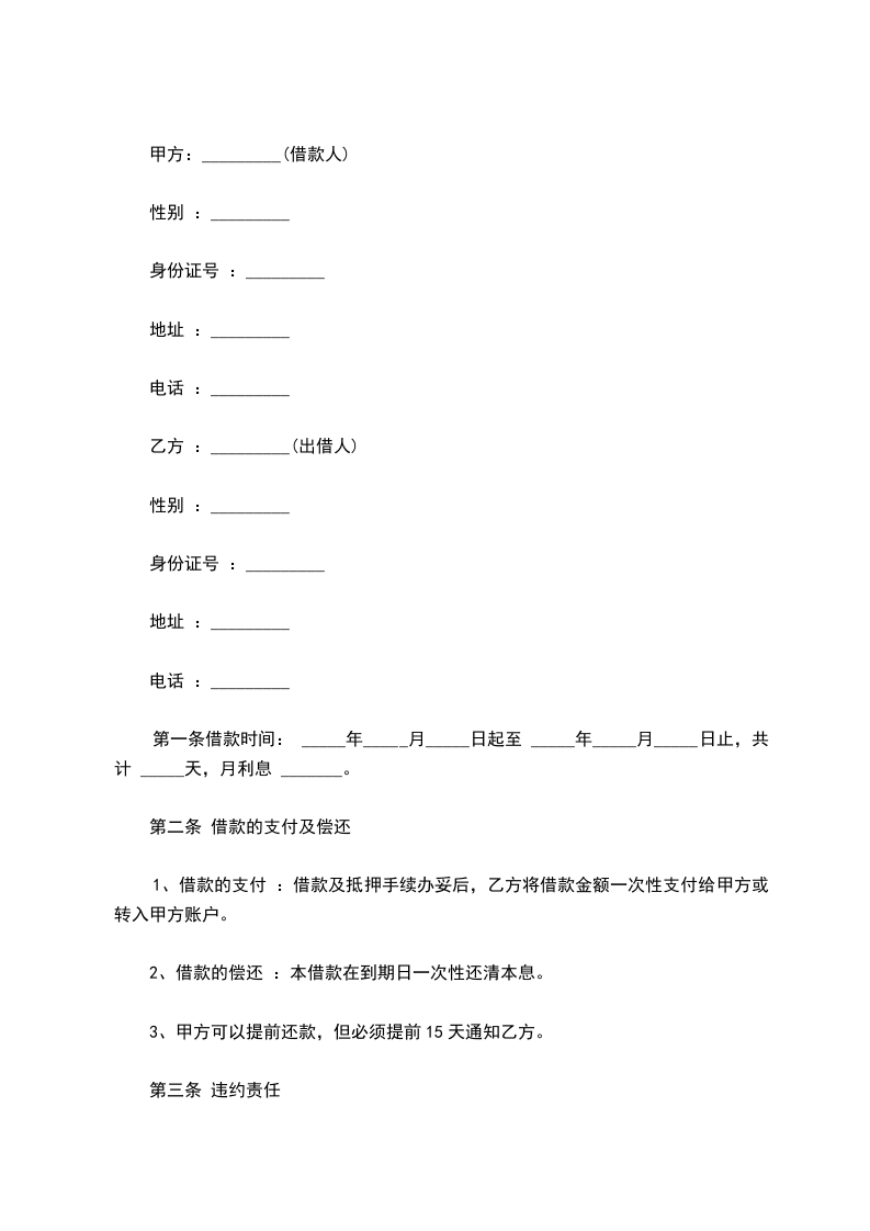 第一条甲方向乙方提供借款资金人民币(大写)【】,小写【】元。