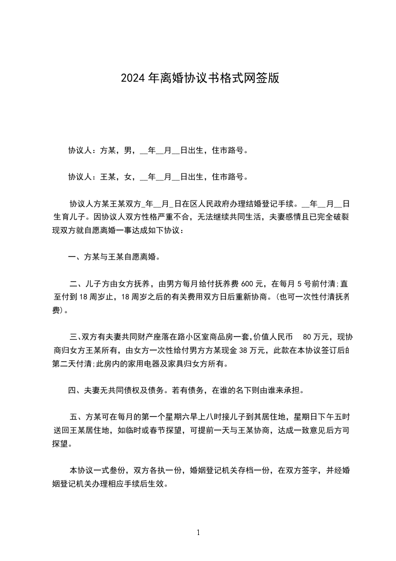 协议人:方某,男,__年__月__日出生,住市路号。
