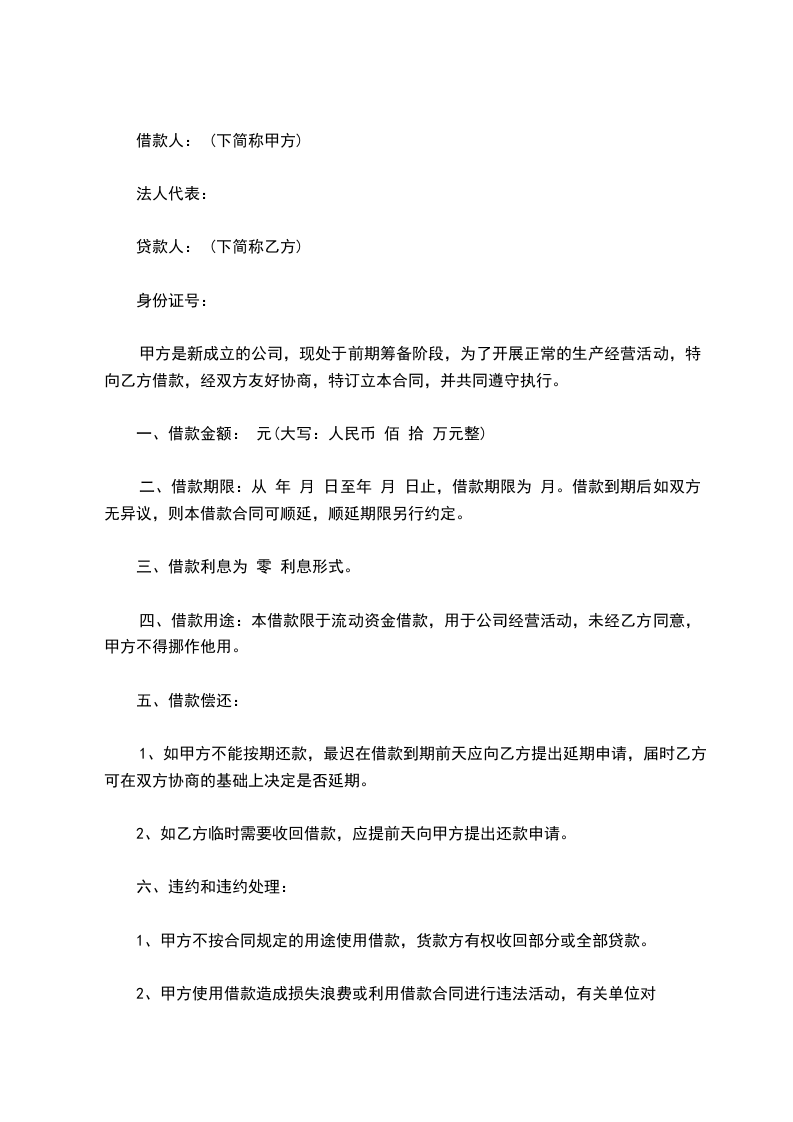 甲方是新成立的公司,现处前期筹备阶段,为了开展正常的生产经营活动,特向乙方借款,经双方友好协商,特订立本合同,并共同遵守执行。
