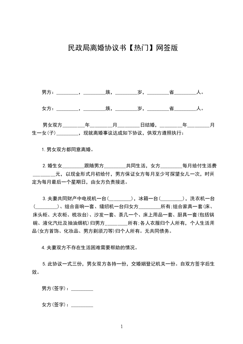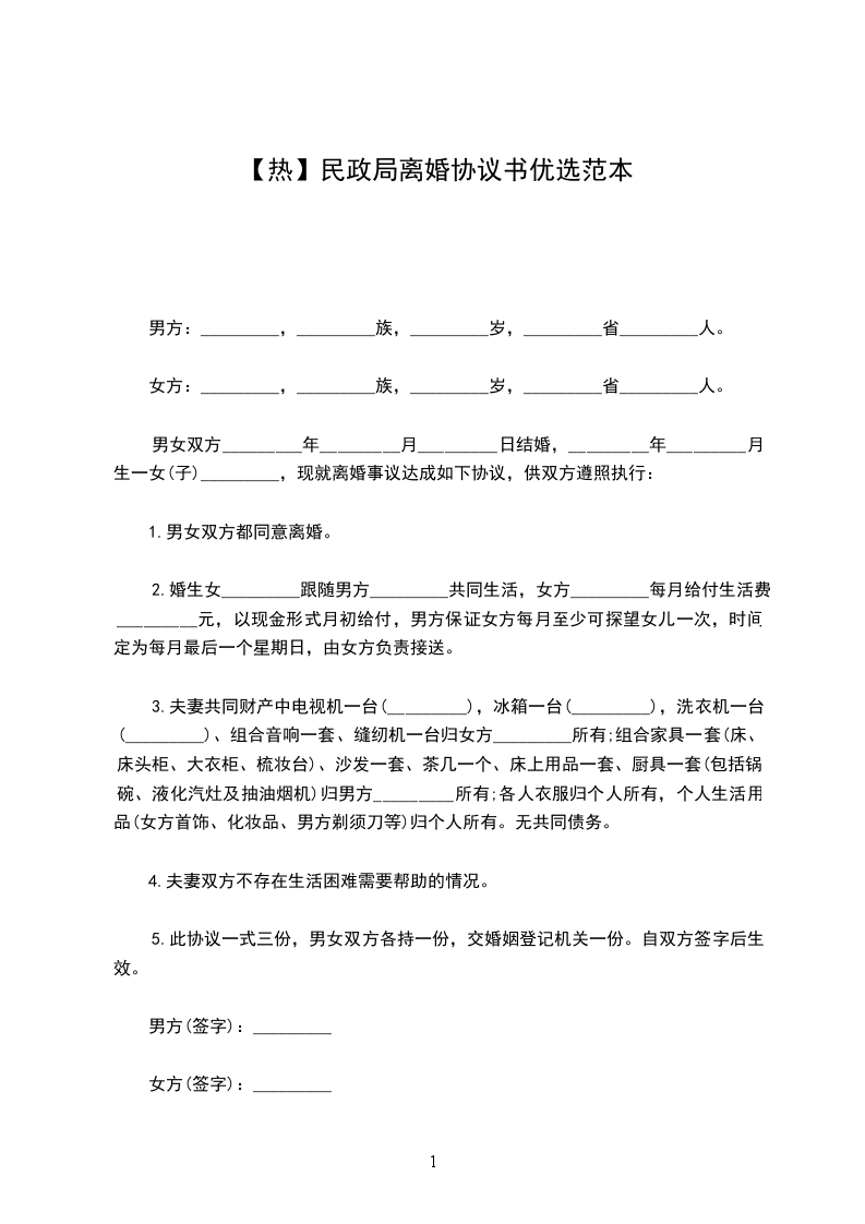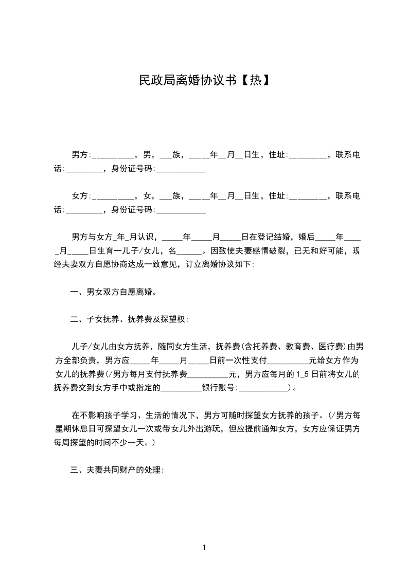 男方与女方_年_月认识,_____年_____月_____日在登记结婚,婚后_____年_____月_____日生育一儿子/女儿,名______。因致使夫妻感情破裂,已无和好可能,现经夫妻双方自愿协商达成一致意见,订立离婚协议如下: