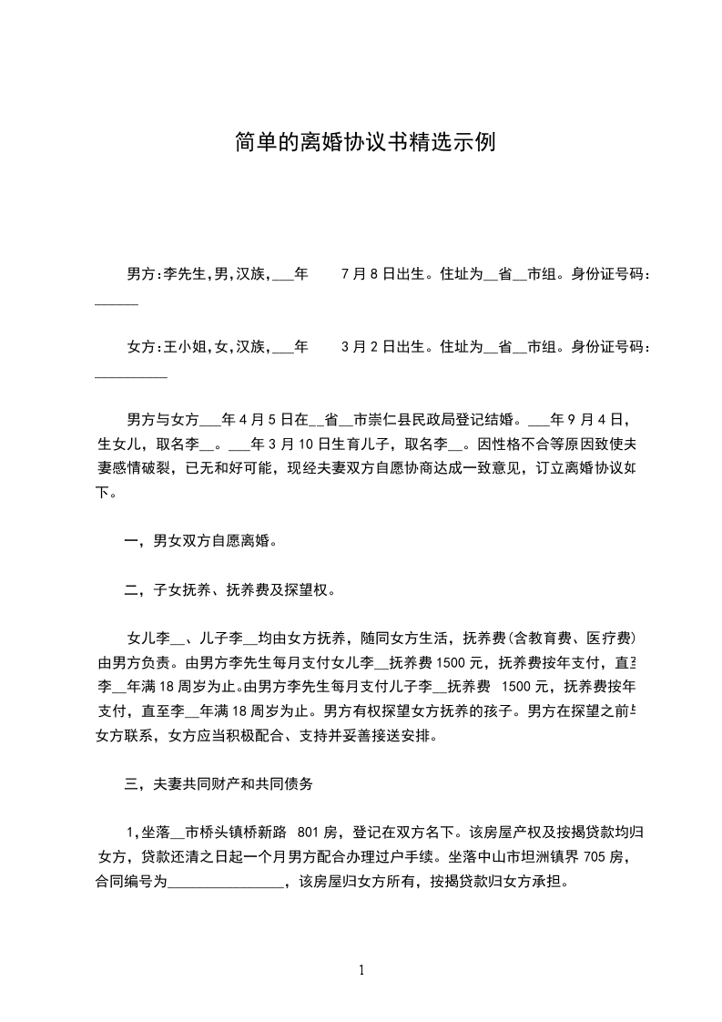 男方与女方___年4月5日在__省__市崇仁县民政局登记结婚。___年9月4日,生女儿,取名李__。___年3月10日生育儿子,取名李__。因性格不合等原因致使夫妻感情破裂,已无和好可能,现经夫妻双方自愿协商达成一致意见,订立离婚协议如下。