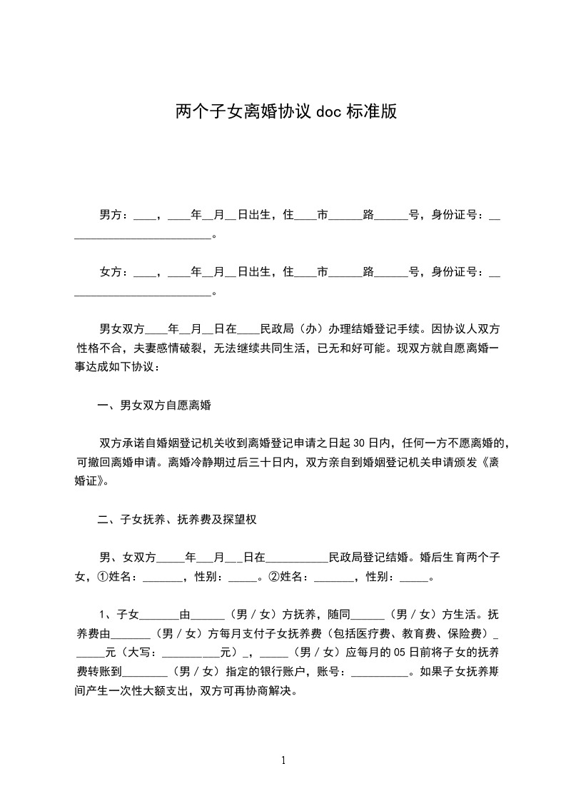 篇2男方:,__族,_月_日生,现住。身份证号码:。女方:,__族,__年__月__日生,现住。身份证号码:。双方年日在六盘水市钟山区民政局登记结婚,婚后_月_日生育孩子,取名能,经双方协商达成一致意见,订立离婚协议如下: