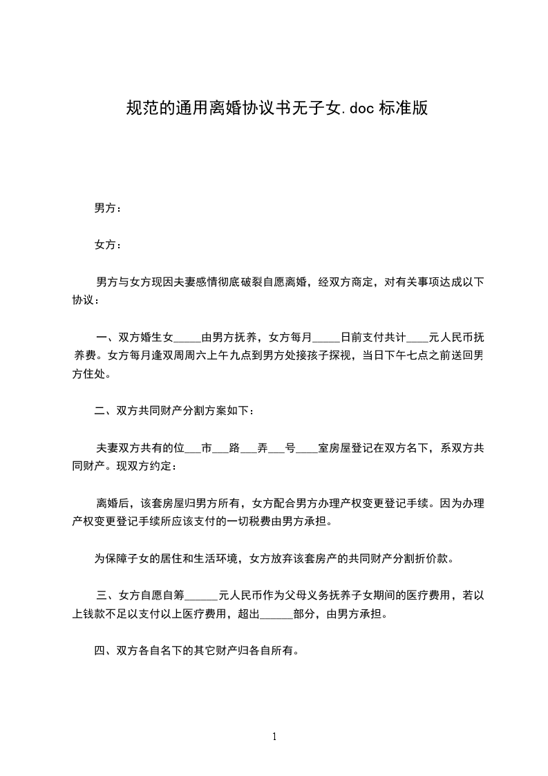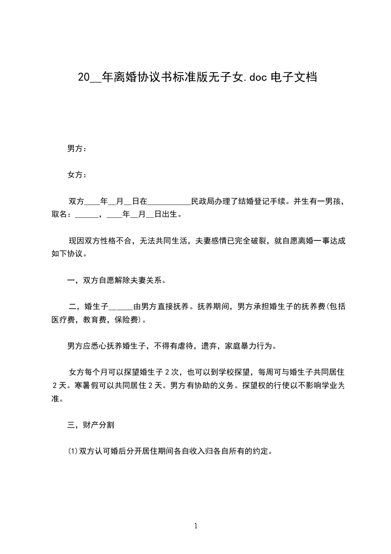 男方与女方______年____月相识,并______年____月____日在_________民政局登记结婚,婚后______年____月____日生育一儿子/女儿,名_________。因____________________________致使夫妻双方感情破裂,且已无任何和好可能,现经双方自愿协商达成一致意见,订立离婚协议如下: