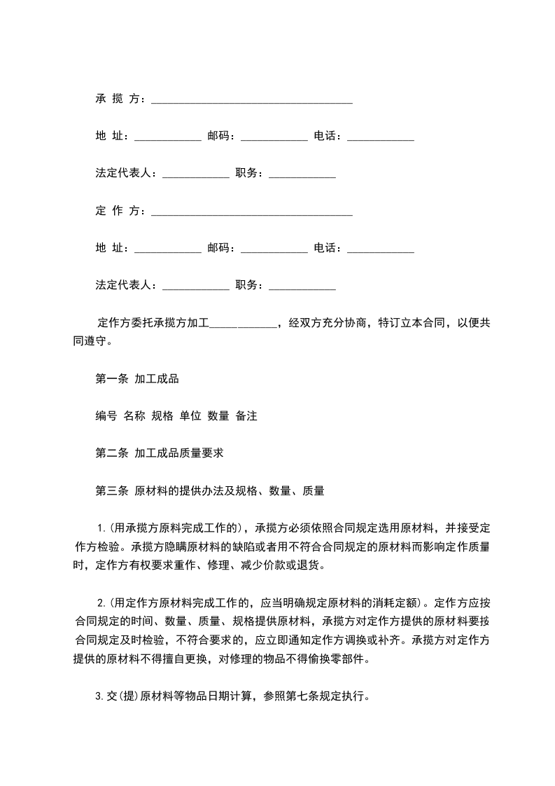 2.(用定作方原材料完成工作的,应当明确规定原材料的消耗定额)。定作方应按合同规定的时间、数量、质量、规格提供原材料,承揽方对定作方提供的原材料要按合同规定及时检验,不符合要求的,应立即通知定作方调换或补齐。承揽方对定作方提供的原材料不得擅自更换,对修理的物品不得偷换零部件。