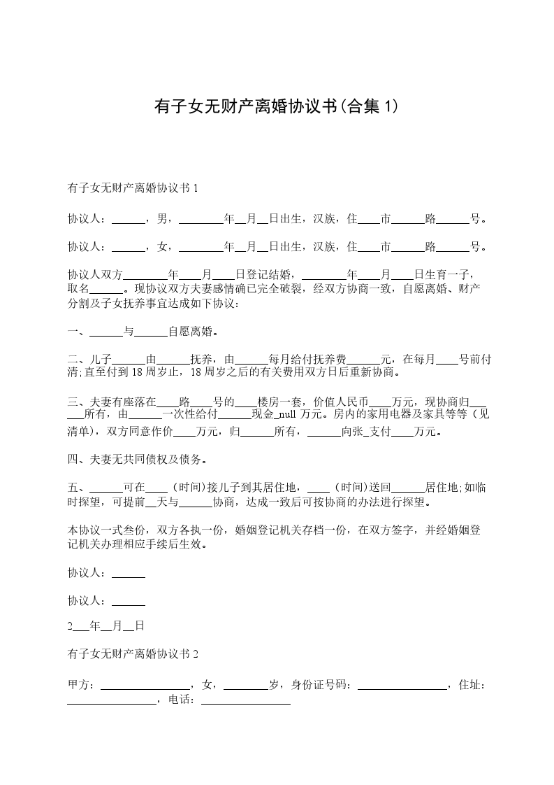 有子女无财产离婚协议书1