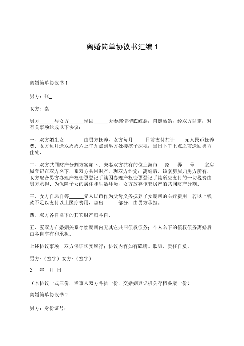 离婚简单协议书1