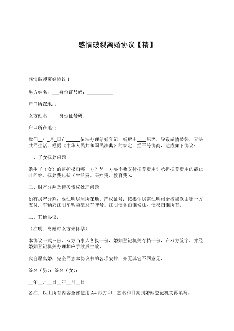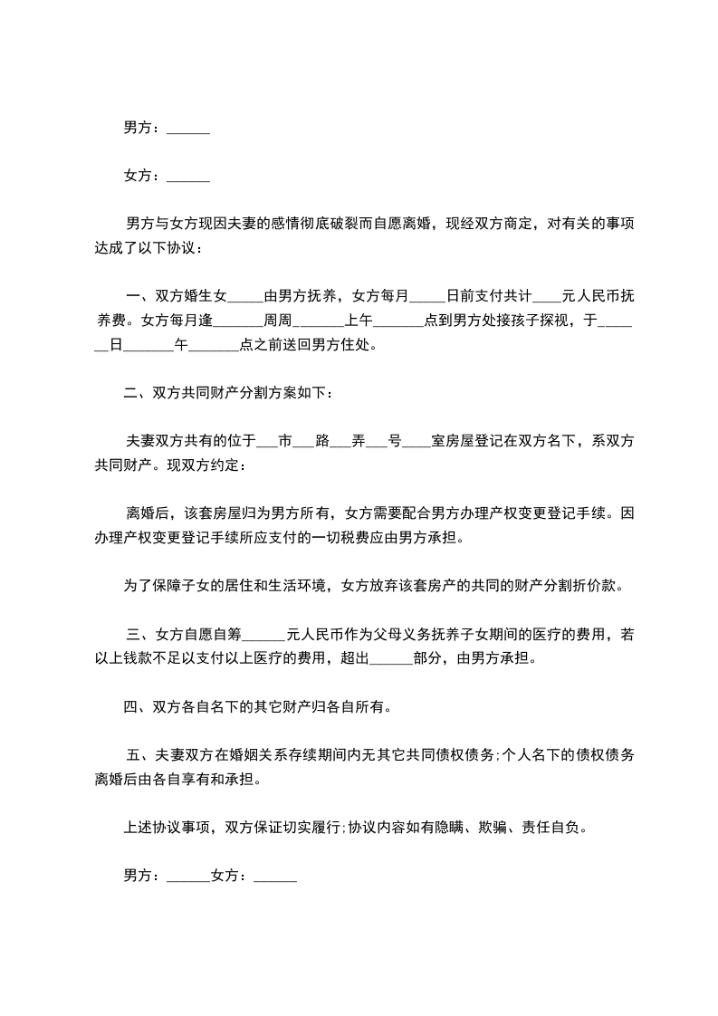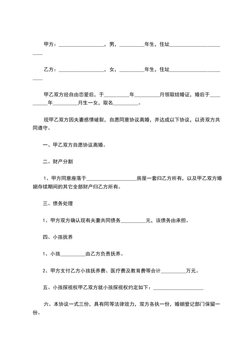 男方与女方_年_月认识,_年__月_日在登记结婚,婚后_年__月_日生育一儿子/女儿,名。因致使夫妻感情破裂,已无和好可能,现经夫妻双方自愿协商达成一致意见,订立离婚协议如下: