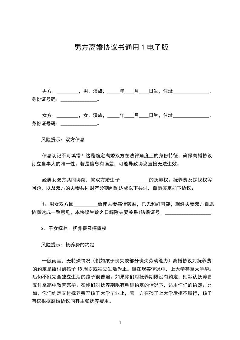 男方:_________,男,汉族,_____年____月____日生,住址_______________,身份证号码:_______________。