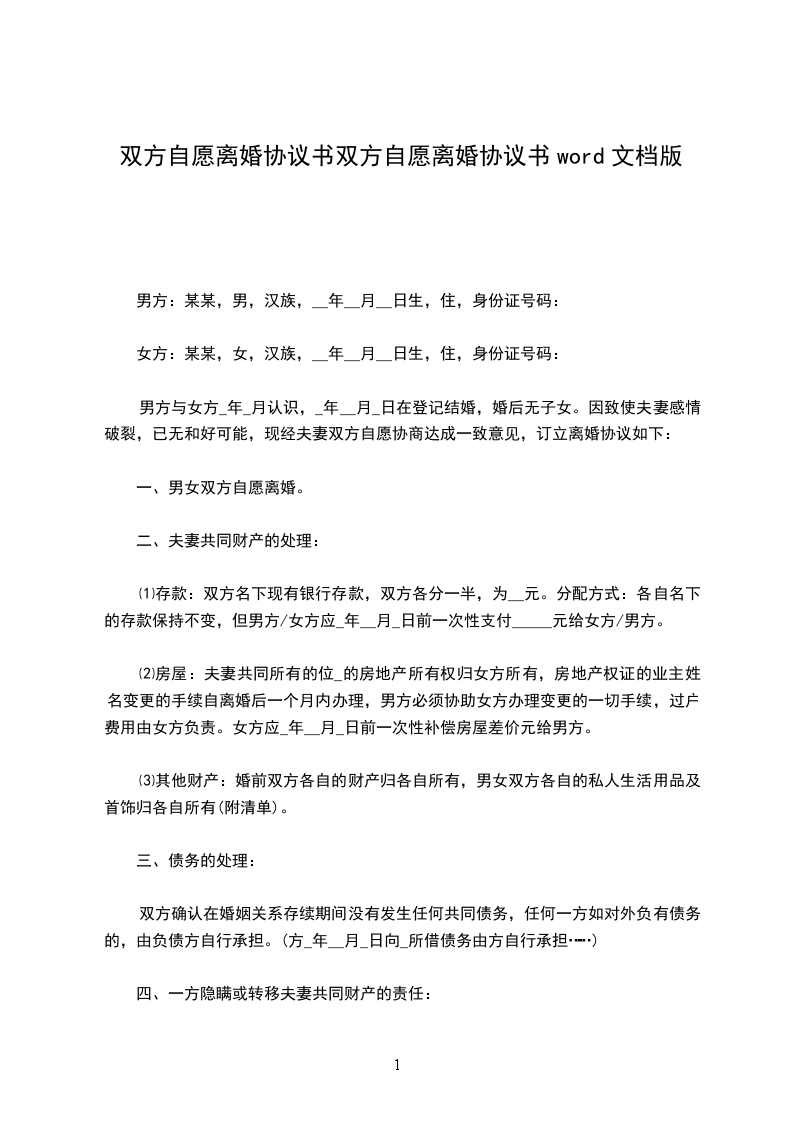 ⑴存款:双方名下现有银行存款,双方各分一半,为__元。分配方式:各自名下的存款保持不变,但男方/女方应_年__月_日前一次性支付_____元给女方/男方。