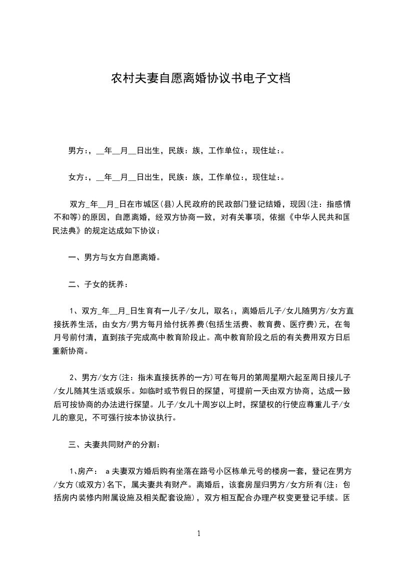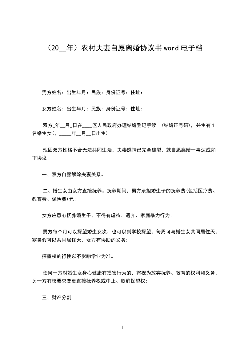 协议人双方____年____月____日在____区人民政府办理结婚登记手续。因双方性格不合无法共同生活,夫妻感情已完全破裂,现双方就自愿离婚一事达成如下协议: