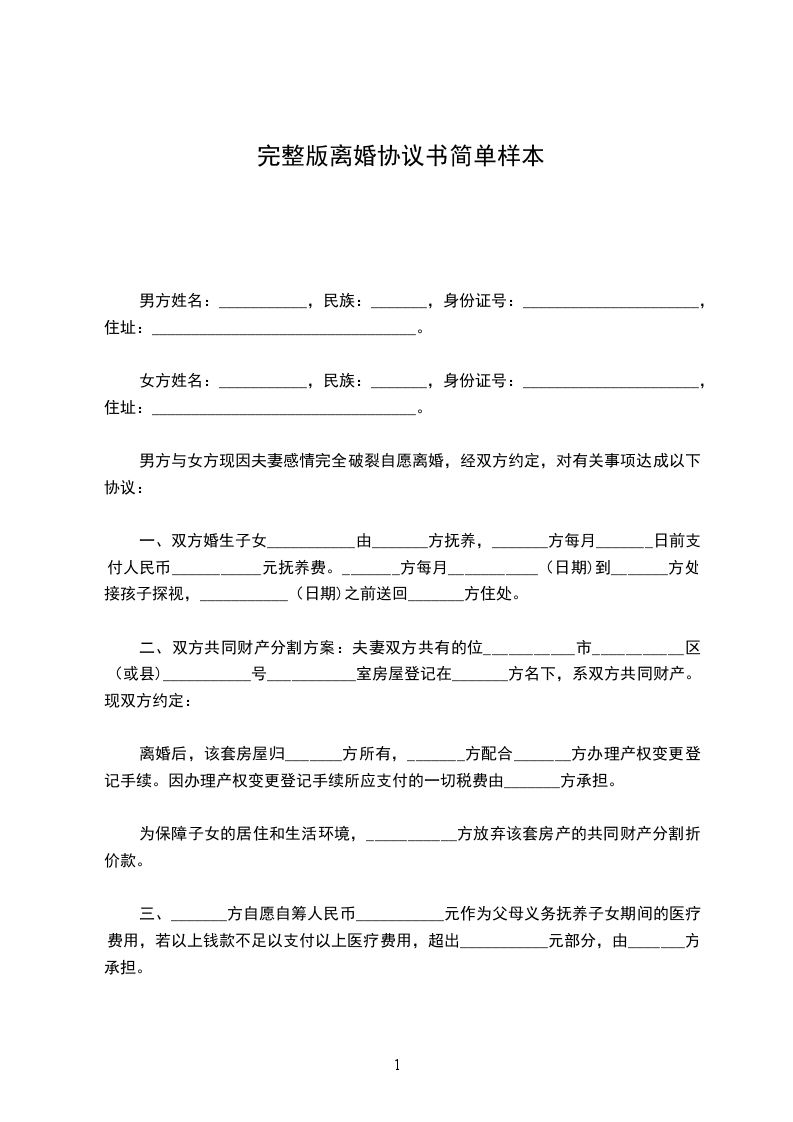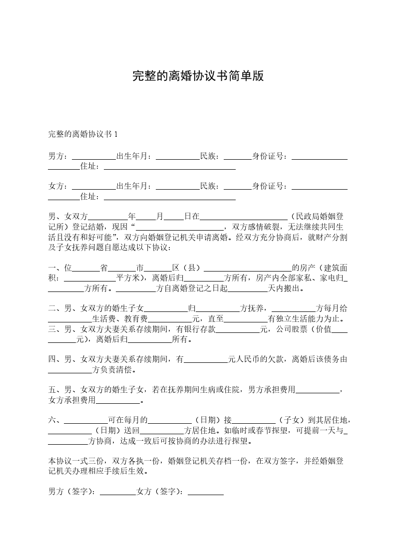 男方与女方_____年___月认识,_____年___月___日在_____________登记结婚,婚后_____年___月___日生育一儿子/女儿,名__________。因__________________致使夫妻感情确已破裂,已无和好可能,现经夫妻双方自愿协商达成一致意见,订立离婚协议如下:
