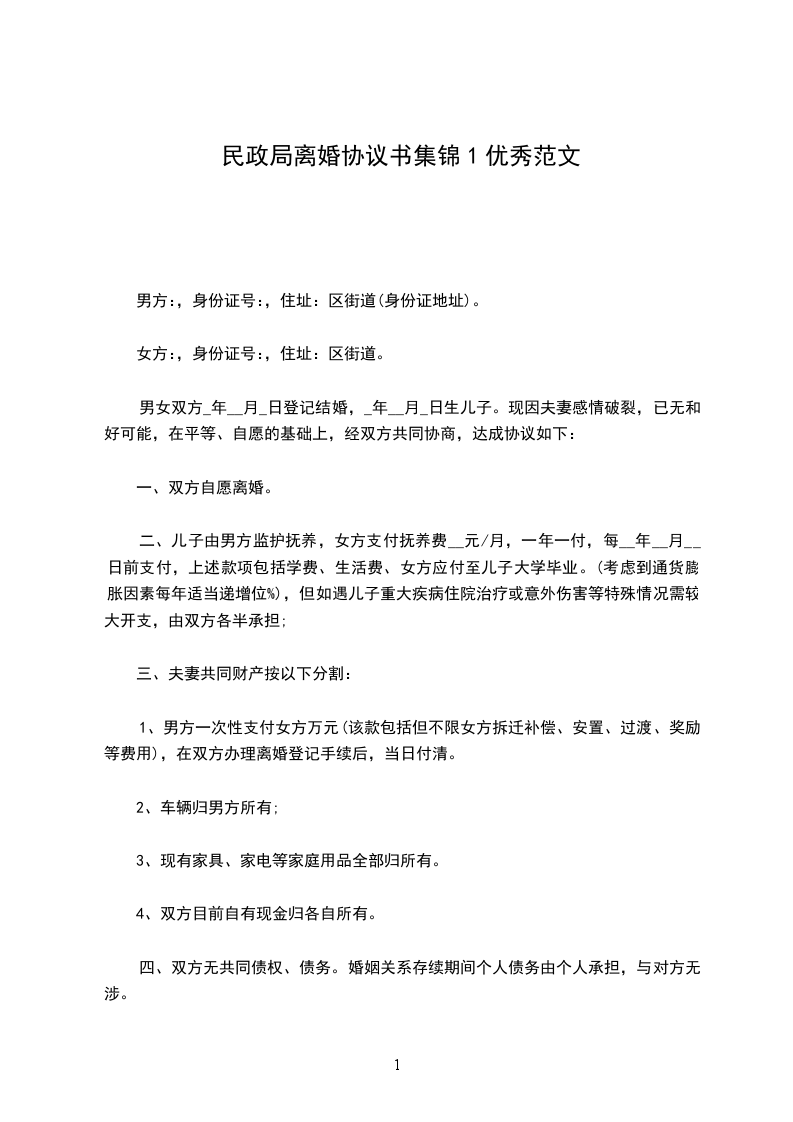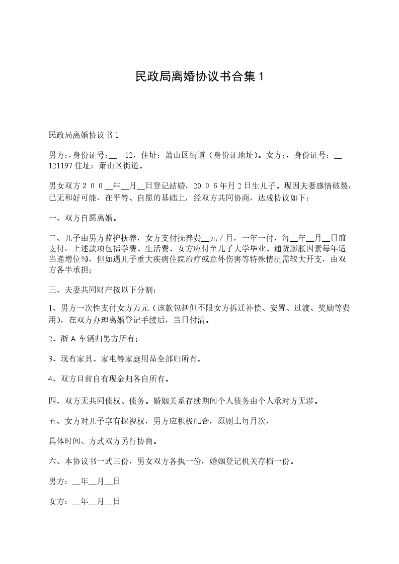 七、本协议书一式三份,甲乙双方各执一份,婚姻登记部门保留一份。在双方签字,并经婚姻登记机关办理相应手续后生效。
