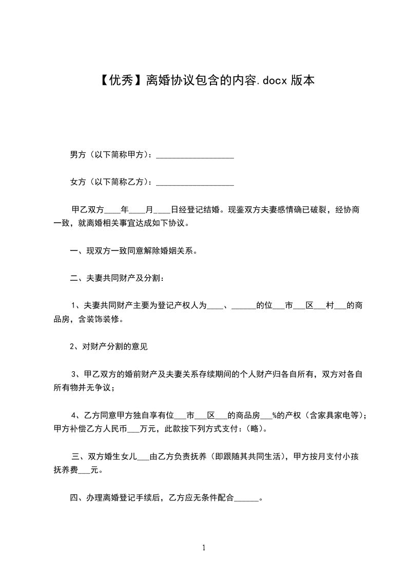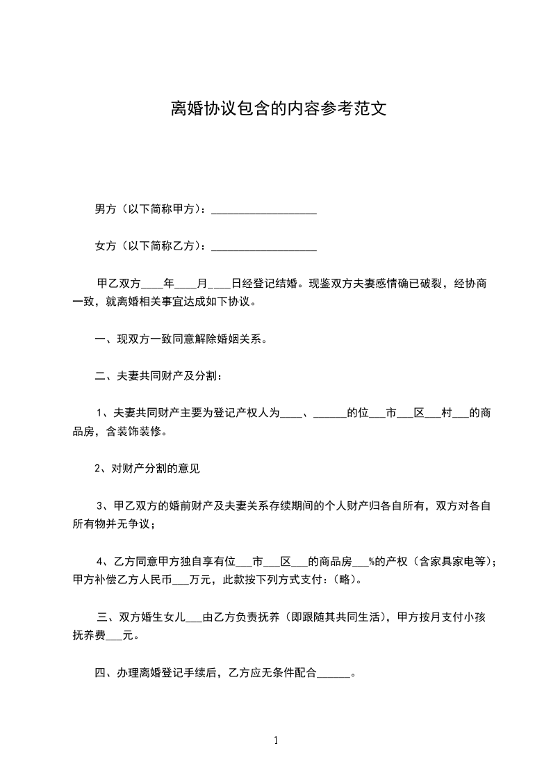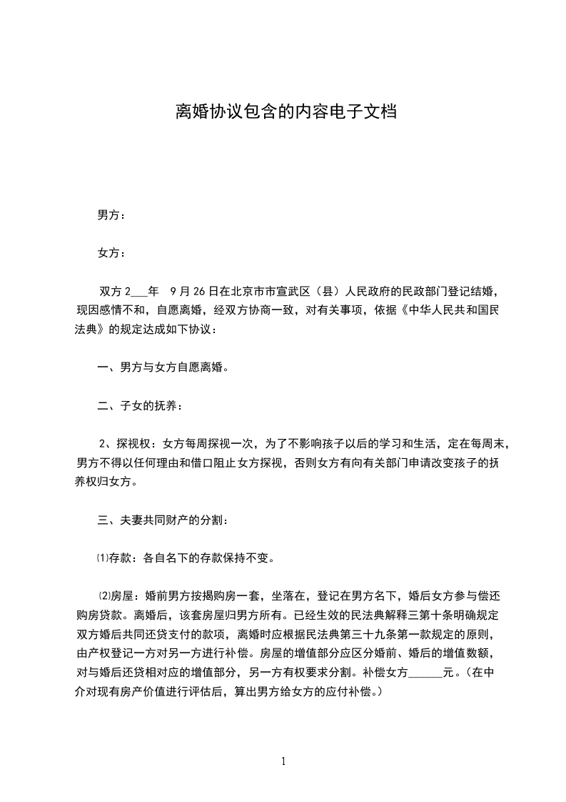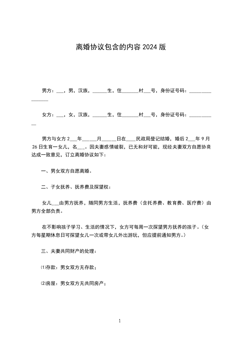 男方与女方2___年______月______日在____民政局登记结婚,婚后2___年9月26日生育一女儿,名___。因夫妻感情破裂,已无和好可能,现经夫妻双方自愿协商达成一致意见,订立离婚协议如下:
