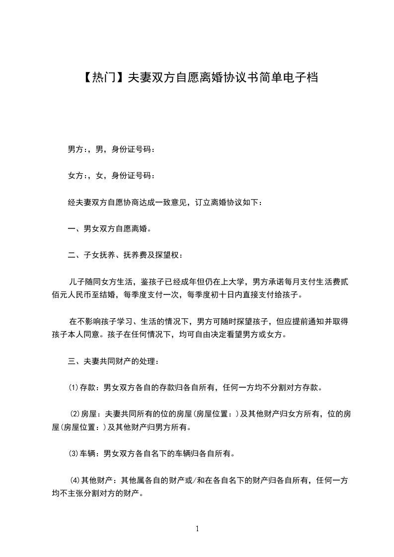 经夫妻双方自愿协商达成一致意见,订立离婚协议如下: