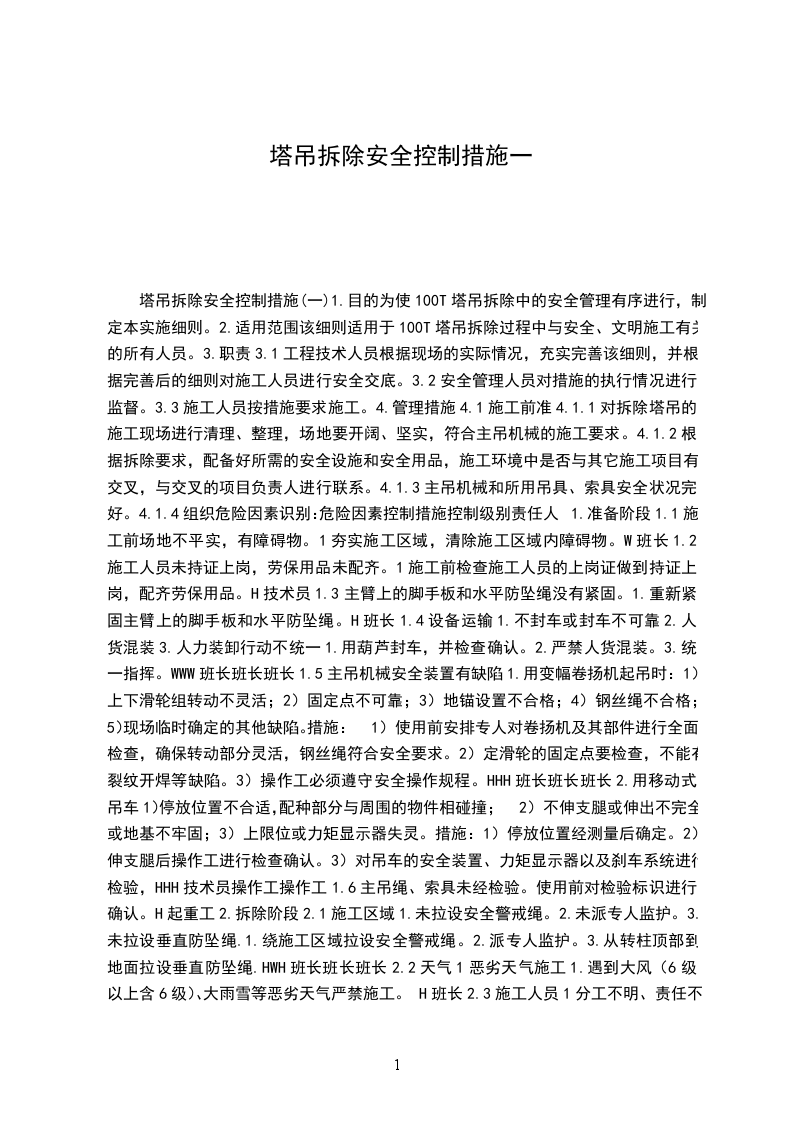 1.目的为使100T塔吊拆除中的安全管理有序进行,制定本实施细则。