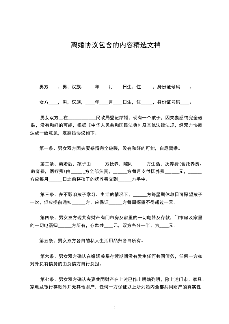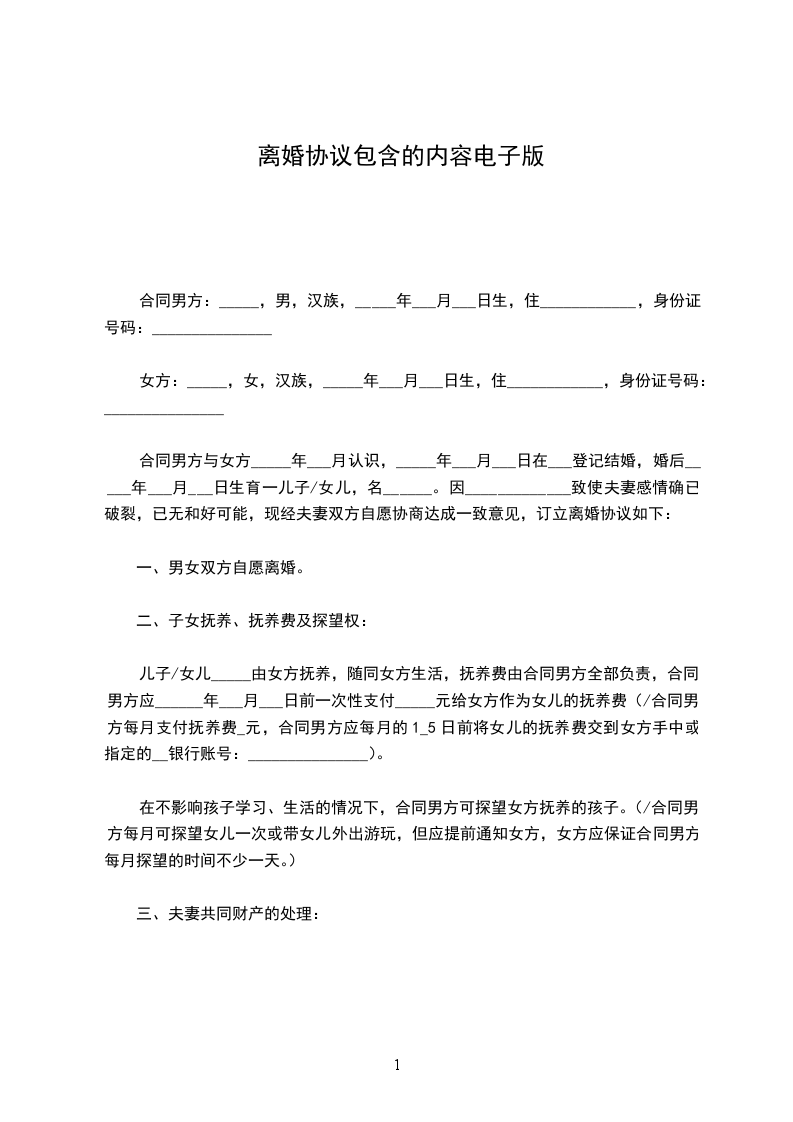 男方与女方_年__月_日在登记结婚,婚后_年__月_日生育一(儿子/女儿),名。因致使夫妻感情确已破裂,已无和好可能,现经夫妻双方自愿协商达成一致意见,订立离婚协议如下: