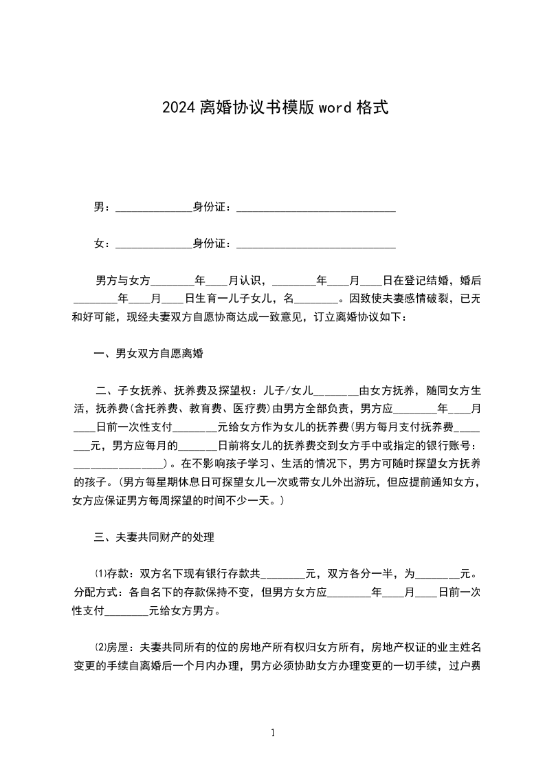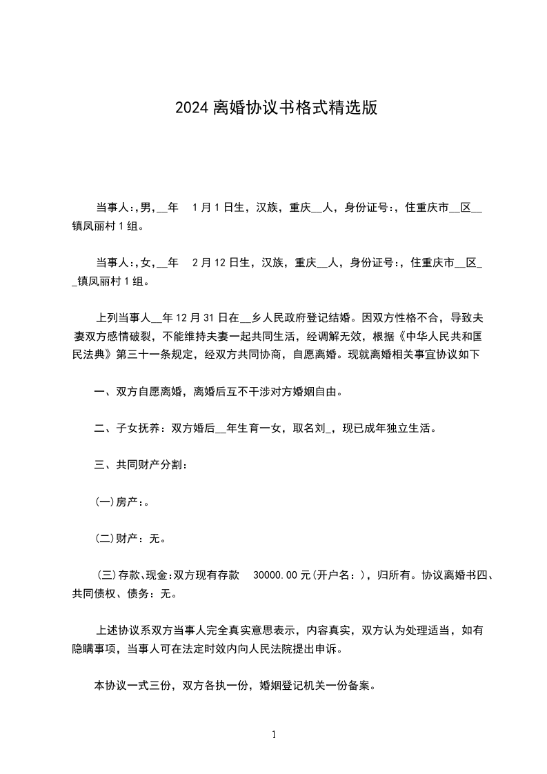 (三)存款、现金:双方现有存款30000.00元(开户名:),归所有。协议离婚书四、共同债权、债务:无。