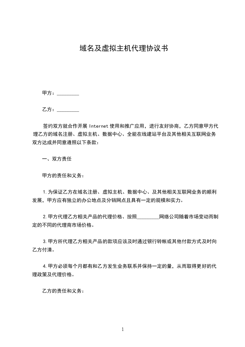 1.为保证乙方在域名注册、虚拟主机、数据中心、及其他相关互联网业务的顺利发展,甲方应有独立的办公地点及分销网点且具有一定的规模和实力。