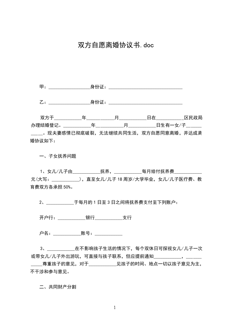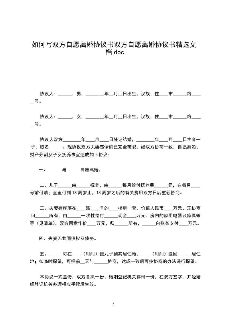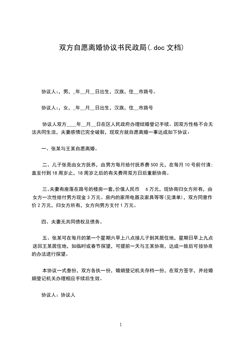 男、女双方_____年经人介绍认识,交往___后,______年____月_____日双方在______民政局办理结婚登记。_____年_____月______日儿子(女儿)出生,取名_____。因夫妻感情不和(或性格不合等原因),自愿离婚,经双方协商一致,对有关事项,达成如下协议: