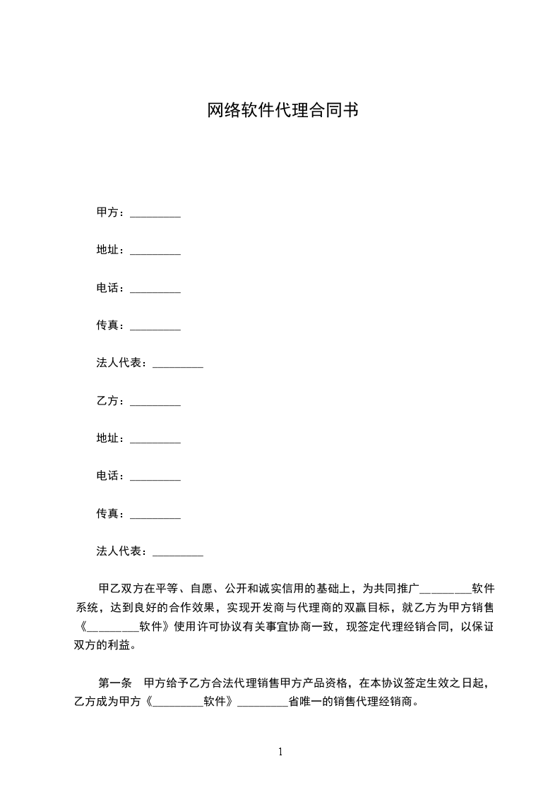第一条 甲方给予乙方合法代理销售甲方产品资格,在本协议签定生效之日起,乙方成为甲方《_________软件》_________省唯一的销售代理经销商。