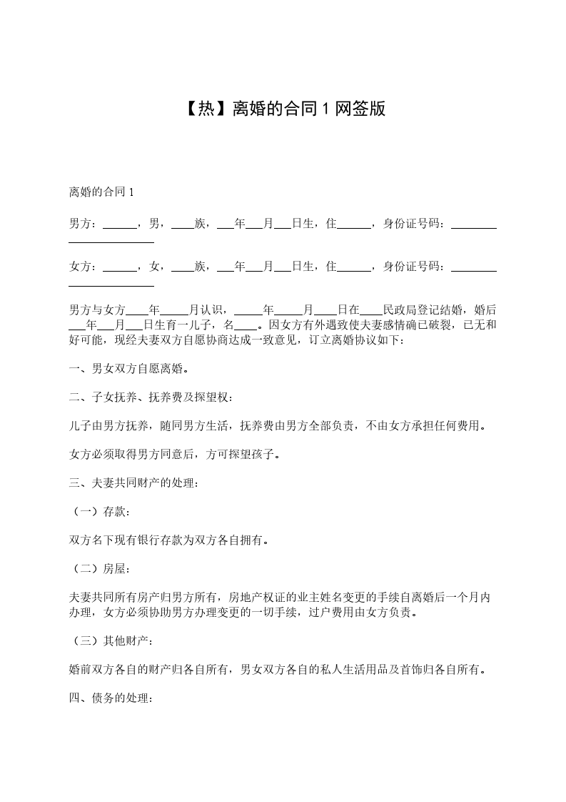 离婚的合同12甲方:_________________,女,汉族,日出生,住址:_________________