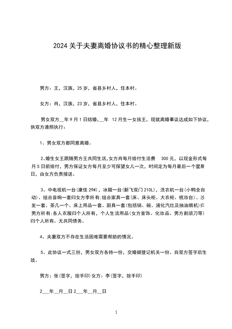 男女双方__年9月1日结婚,__年12月生一女孩王,现就离婚事议达成如下协议,供双方遵照执行: