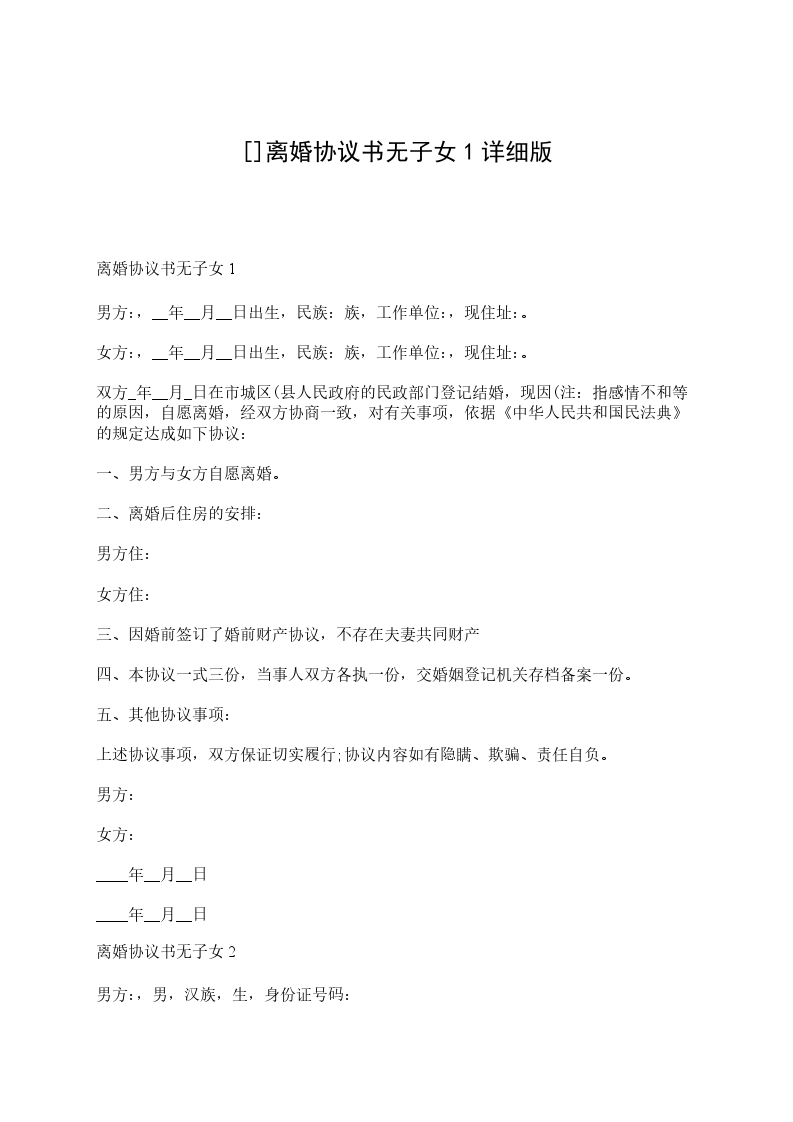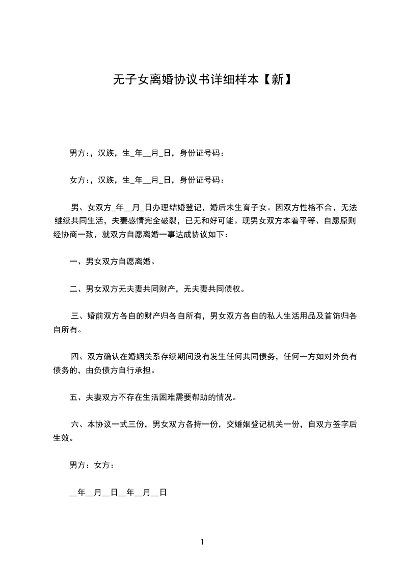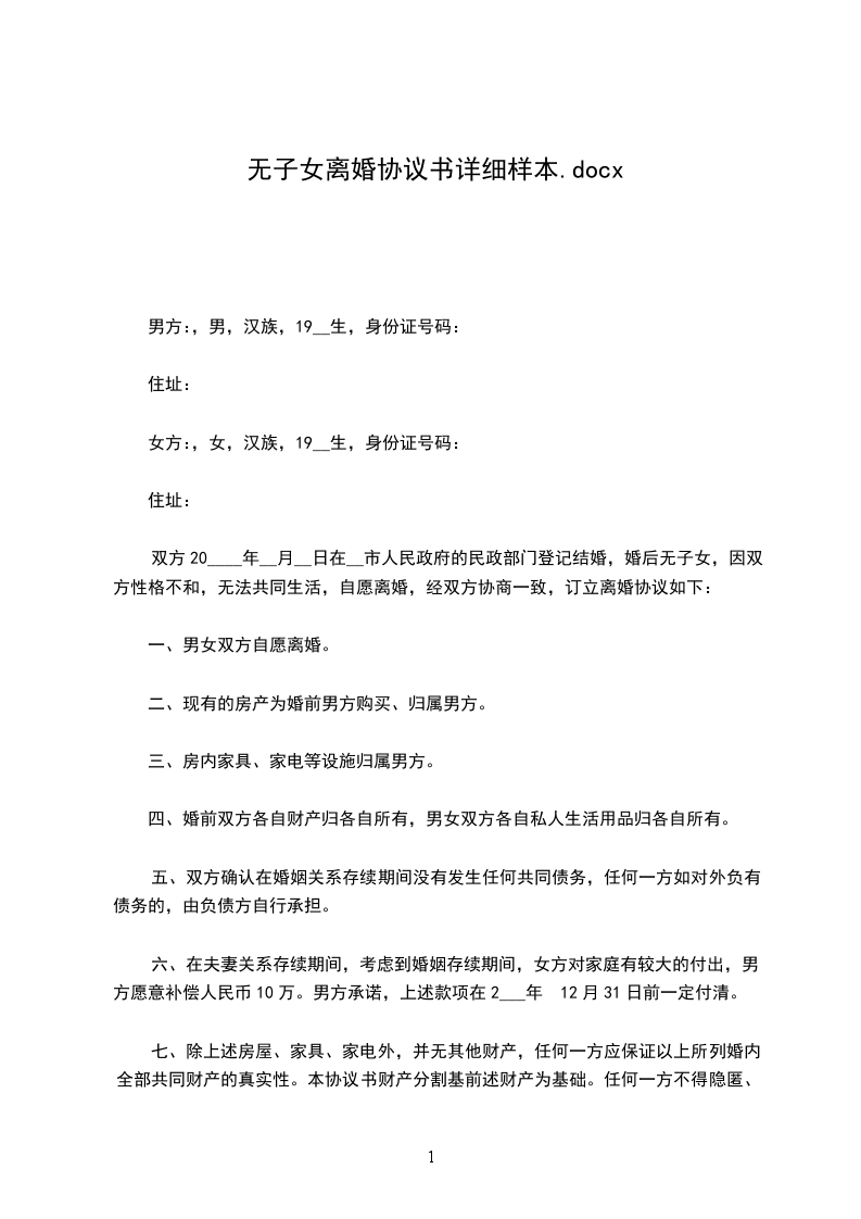 双方20____年__月__日在__市人民政府的民政部门登记结婚,婚后无子女,因双方性格不和,无法共同生活,自愿离婚,经双方协商一致,订立离婚协议如下: