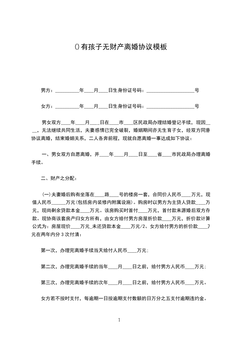 (一)位市区/县路号单元号,共平方,登记户主为的房产,归女方所有。女方向男方支付_____万元,作为补偿。协议经登记生效后,女方应30日内,向男方支付完毕;男方应在30日内,配合女方将房产过户到女方名下。