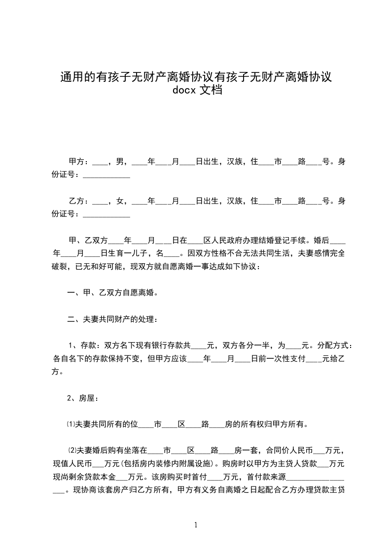 甲、乙双方____年____月____日在____区人民政府办理结婚登记手续。婚后____年____月____日生育一儿子,名____。因双方性格不合无法共同生活,夫妻感情完全破裂,已无和好可能,现双方就自愿离婚一事达成如下协议: