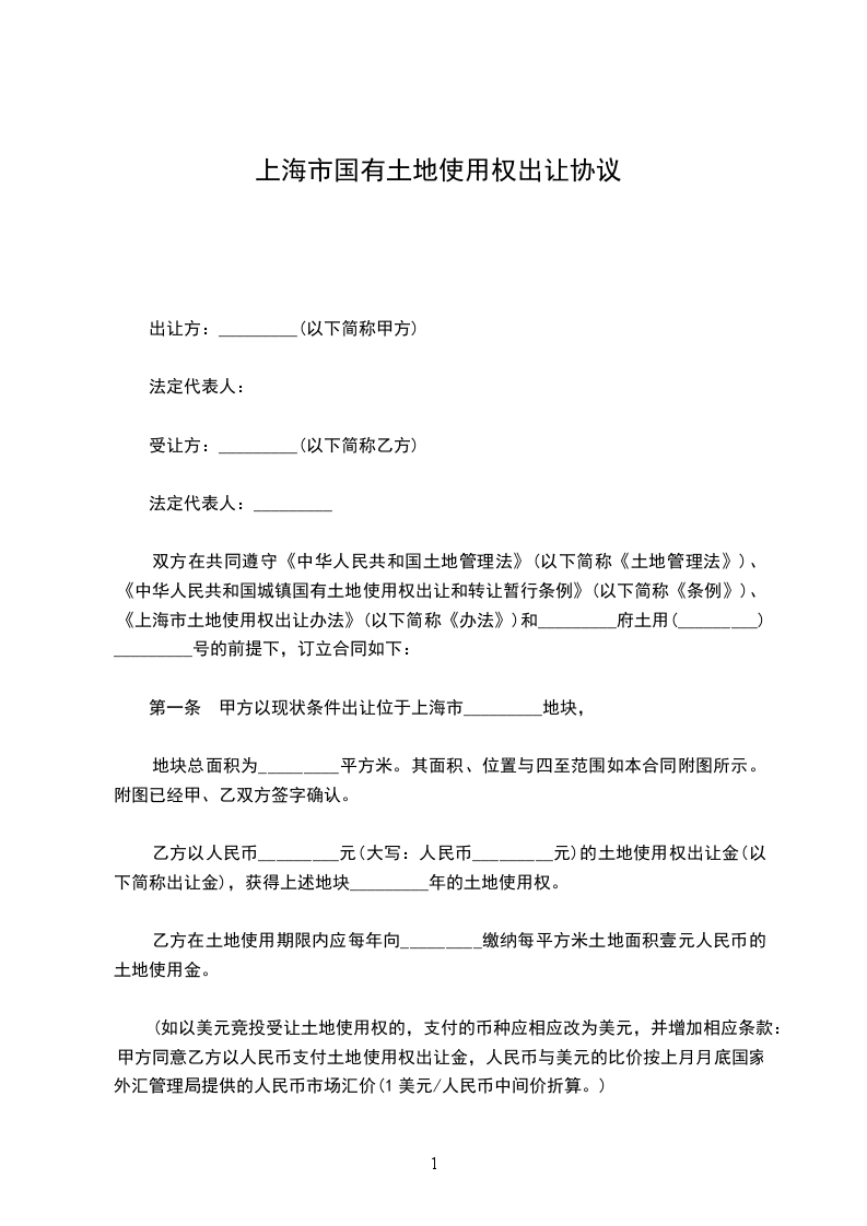 第一条 甲方以现状条件出让位于上海市_________地块,